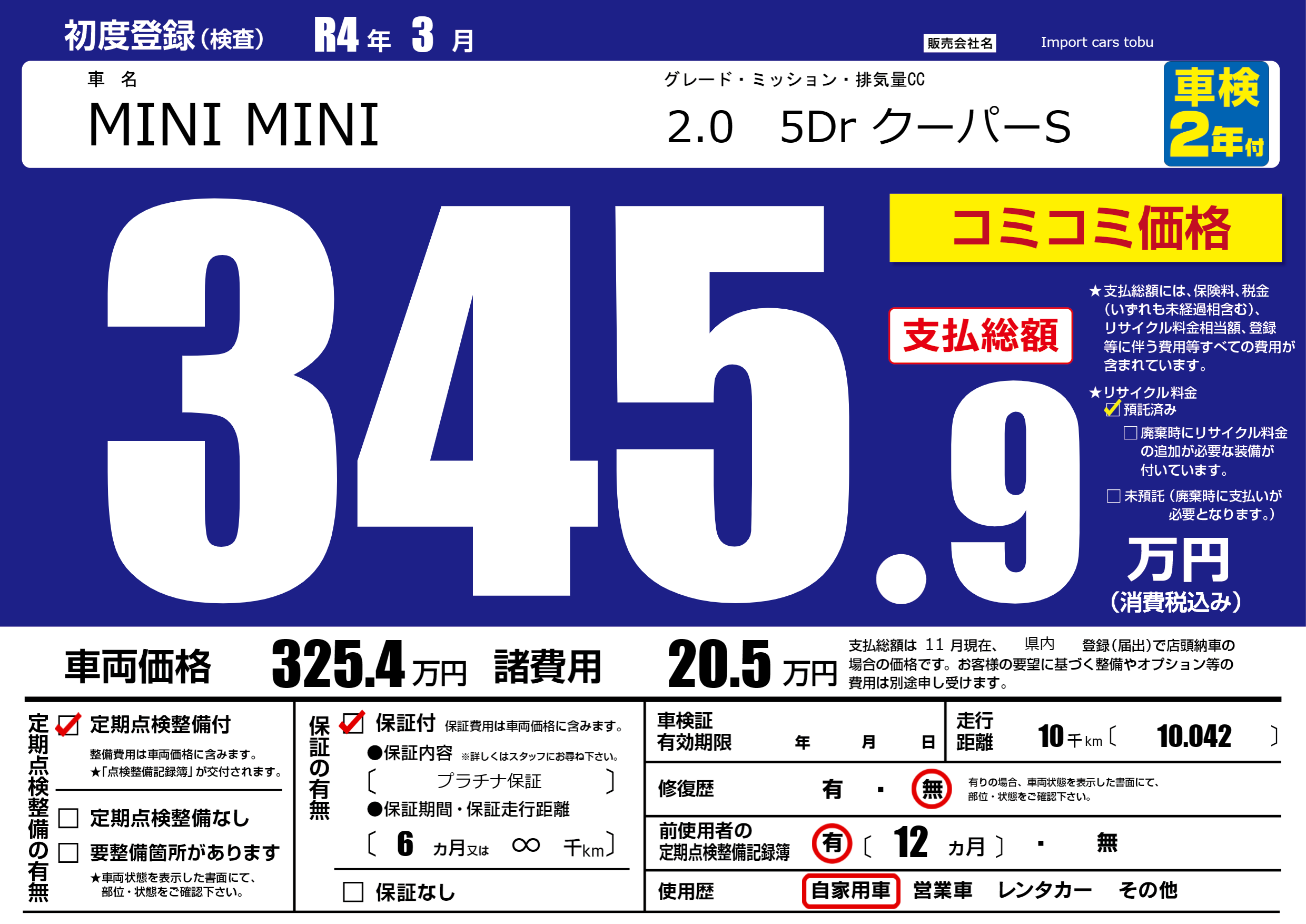 保証付き 保証内容( プラチナ保証) 6ヶ月または(∞)千kmまで |