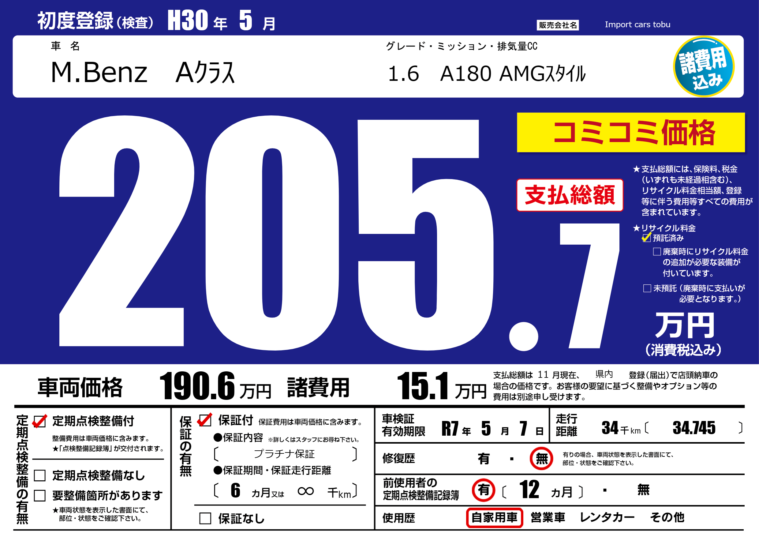 | 車検制限 | R7年 5月 7日 | ||