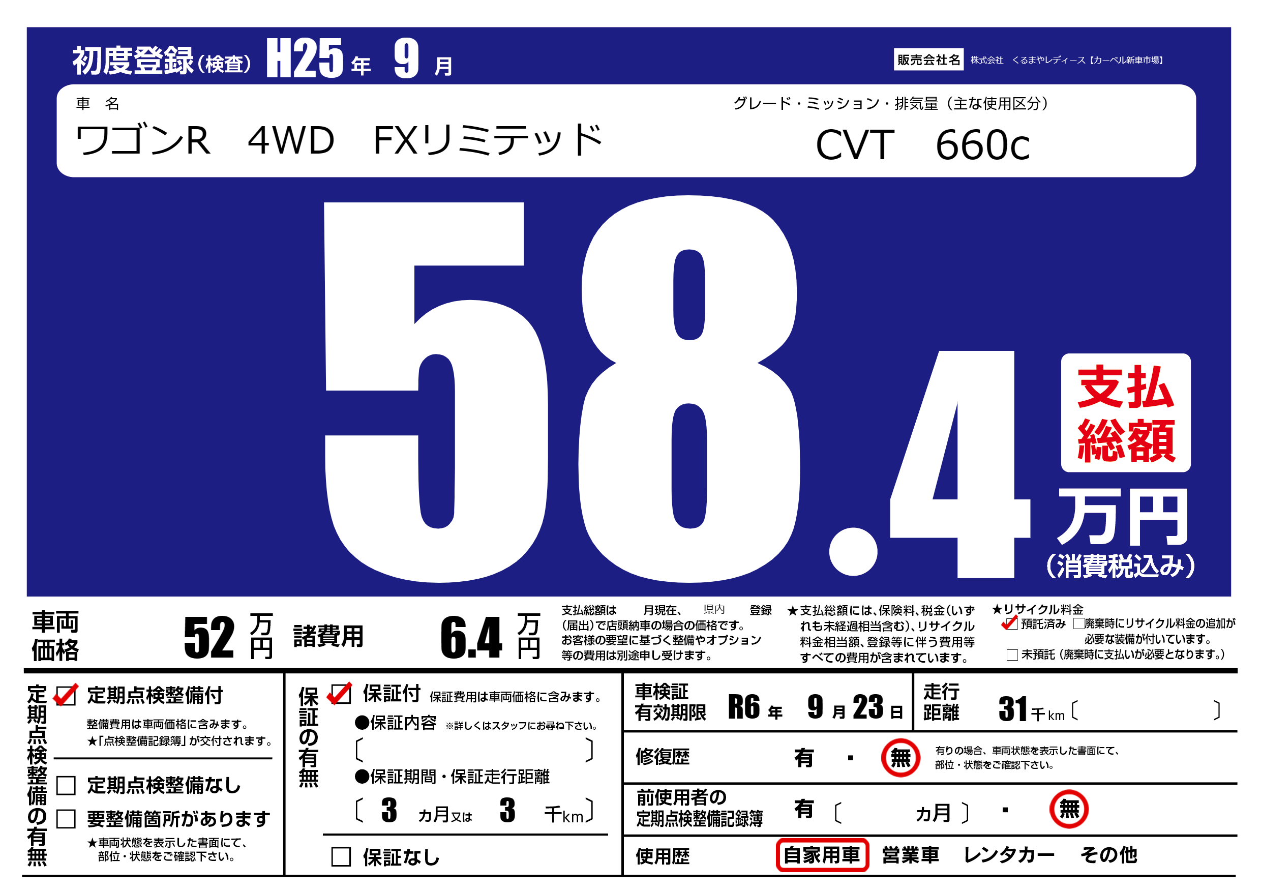 | 走行キロ | 3.1万km | 初年度登録 | H25年9月 |