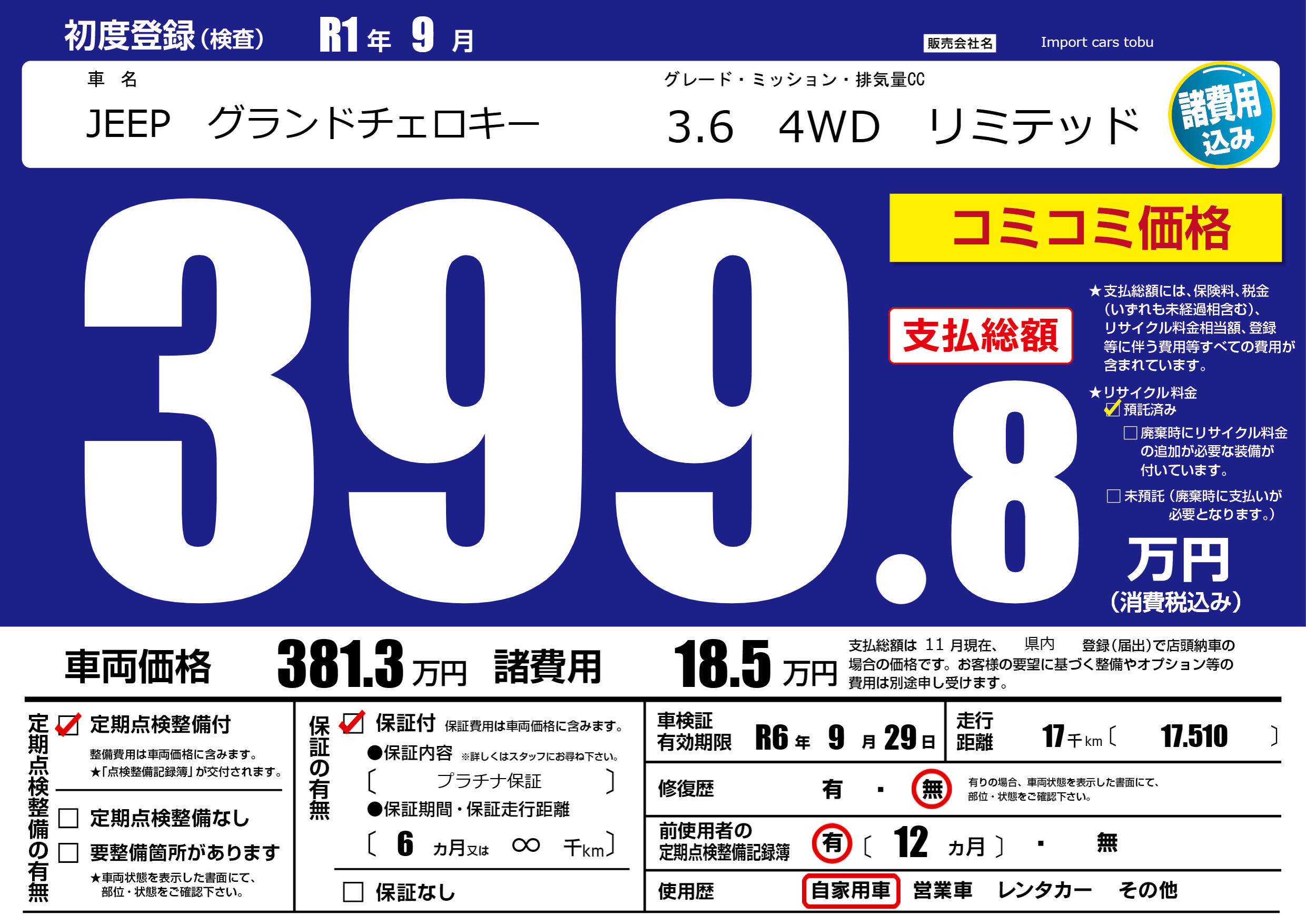 保証付き 保証内容( プラチナ保証) 6ヶ月または(∞)千kmまで |