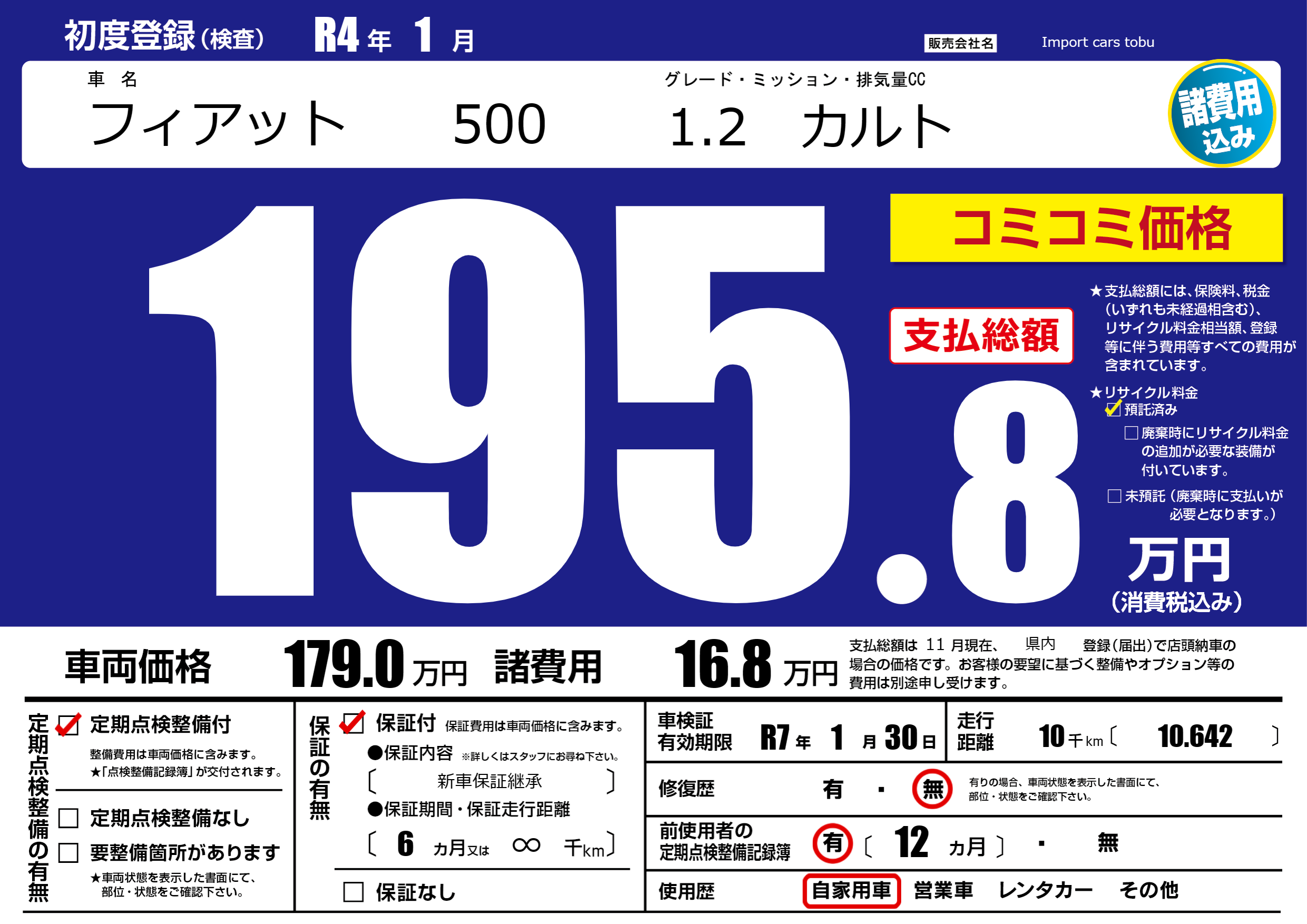| 車名 | フィアット 500 | グレード ミッション 排気量 |