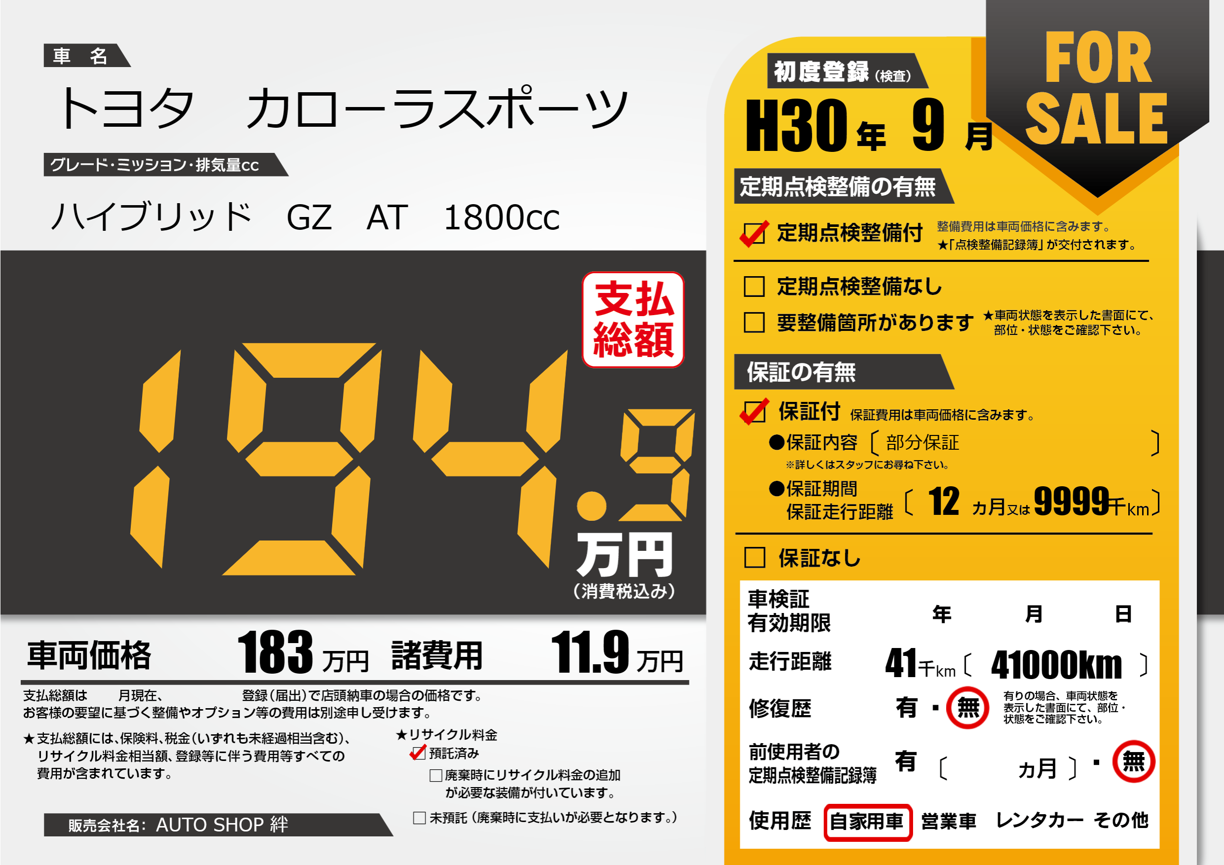 | 車名 | トヨタ カローラスポーツ | グレード ミッション 排気量 |