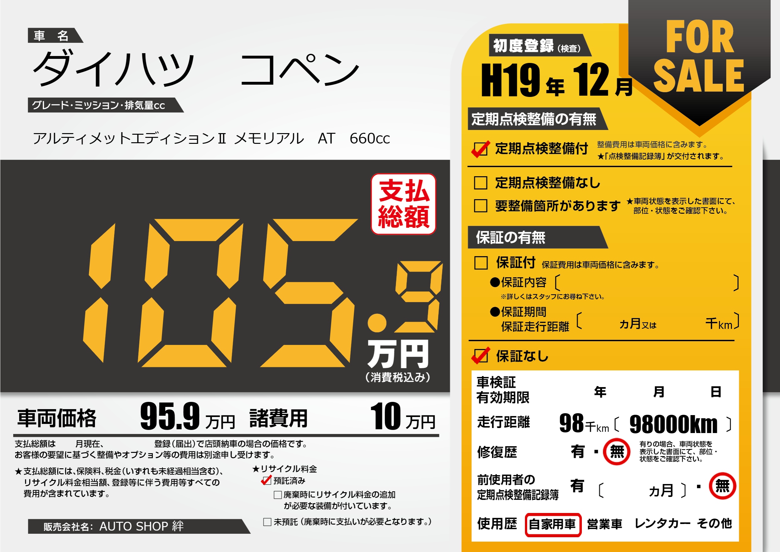 | 車検制限 | - 年 - 月 - 日 | ||
