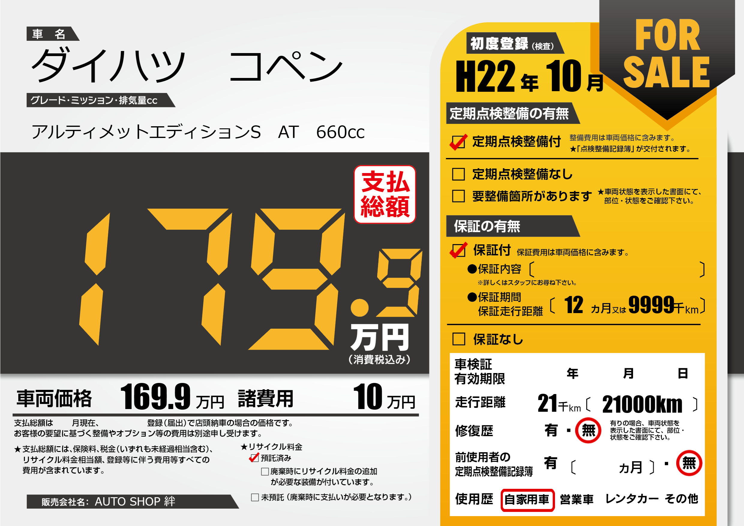保証付き 保証内容(---) 12ヶ月または(9999)千kmまで |