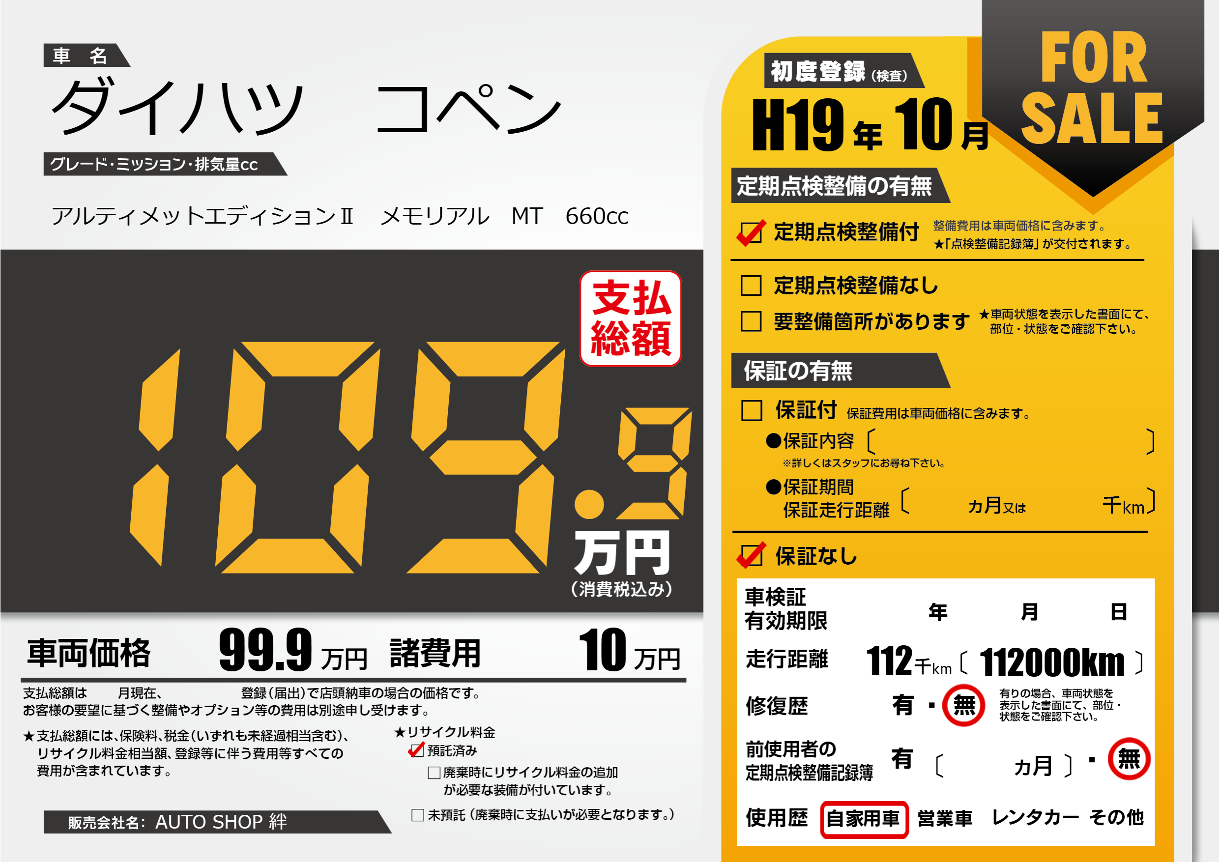 | 車検制限 | - 年 - 月 - 日 | ||