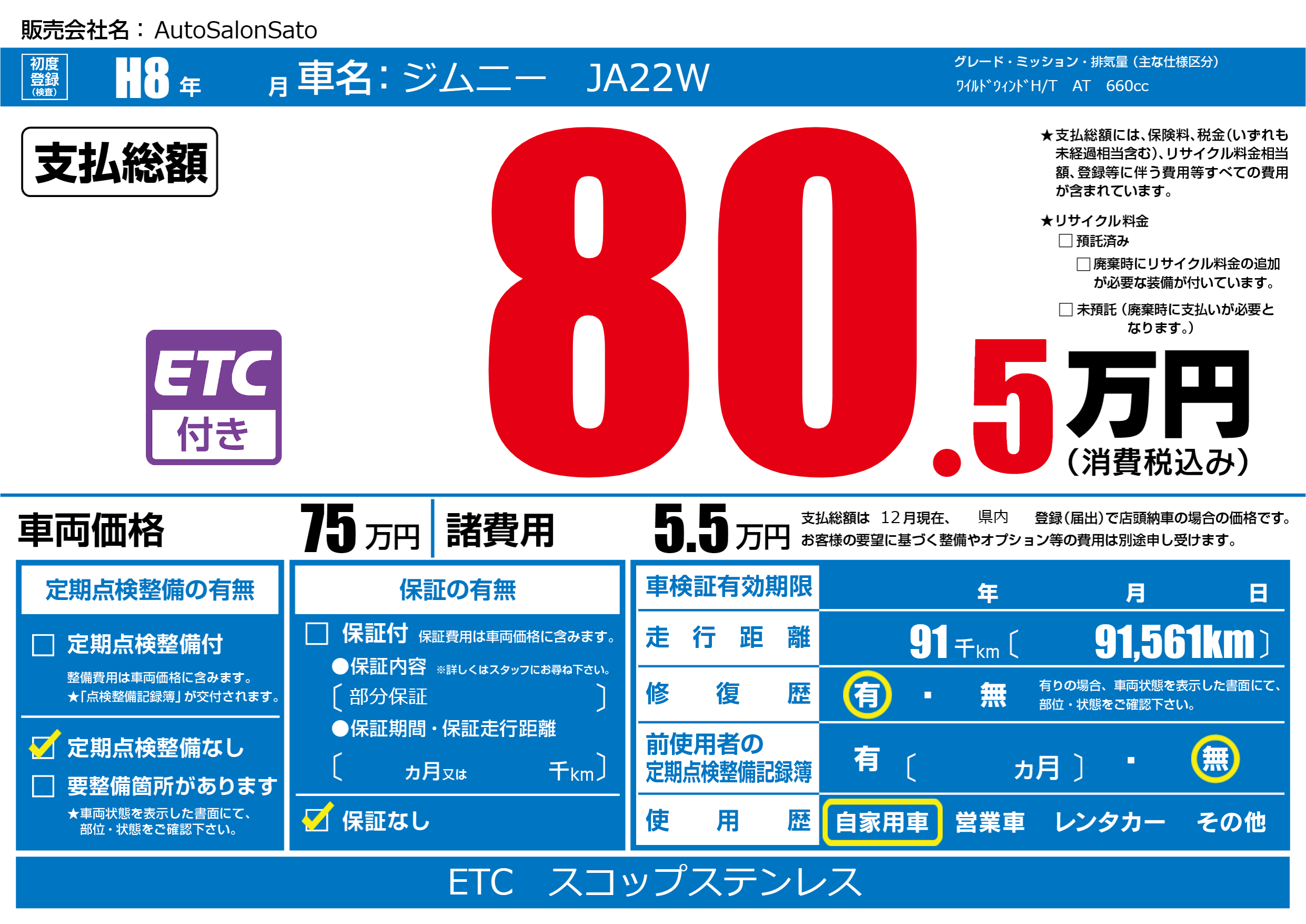 | 走行キロ | 9.1万km | 初年度登録 | H8年---月 |