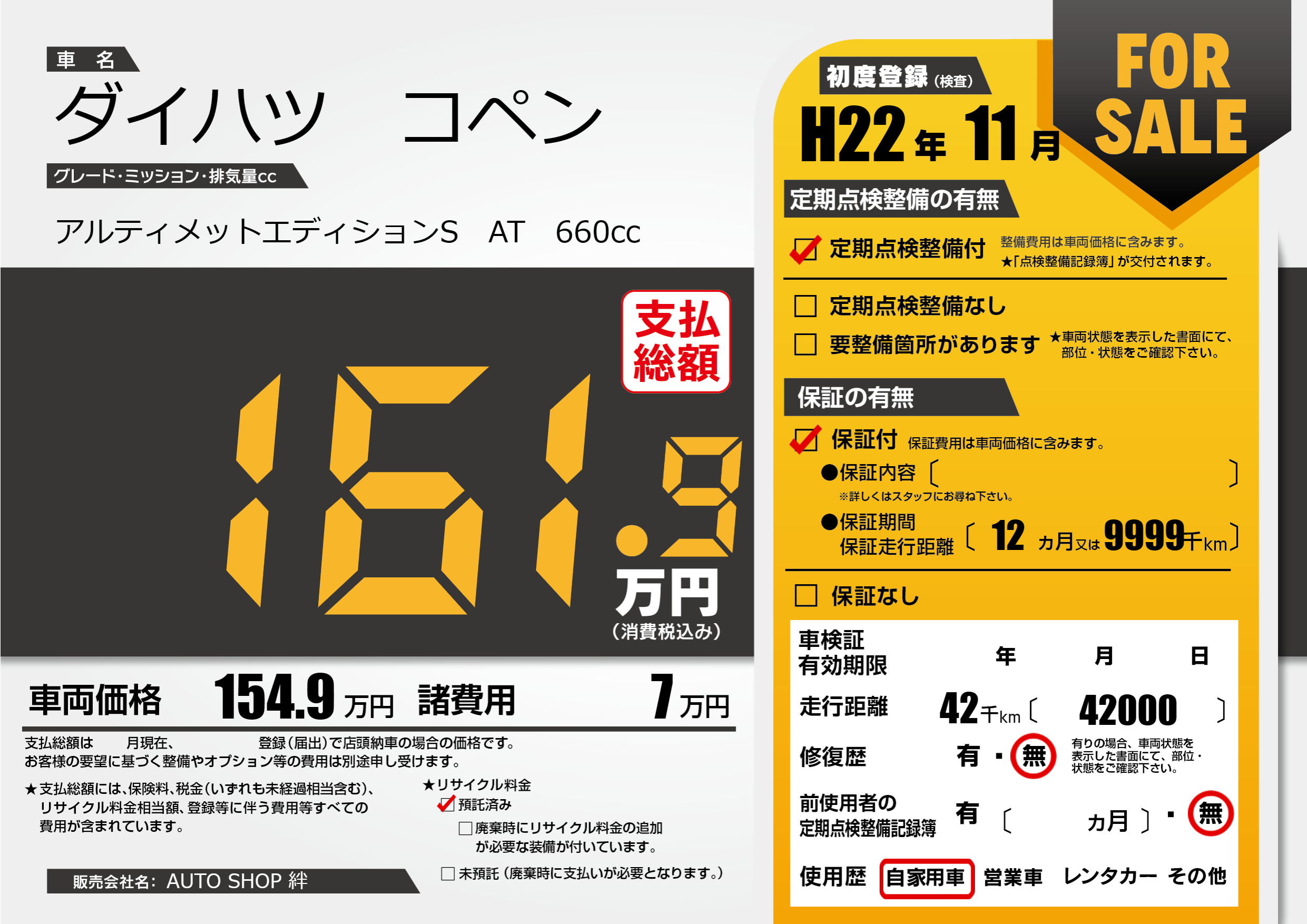 保証付き 保証内容(---) 12ヶ月または(9999)千kmまで |