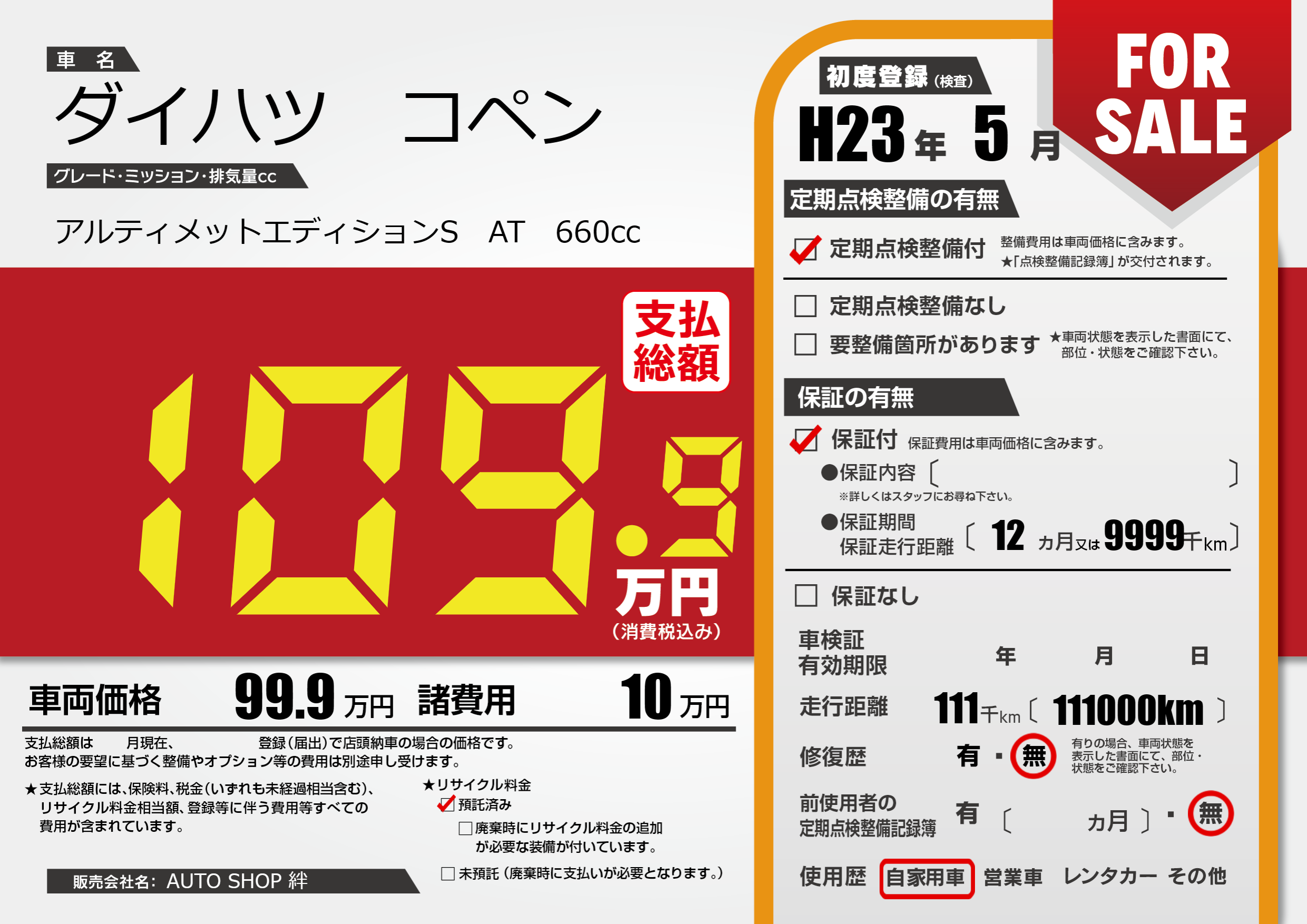 | 車名 | ダイハツ コペン | グレード ミッション 排気量 |