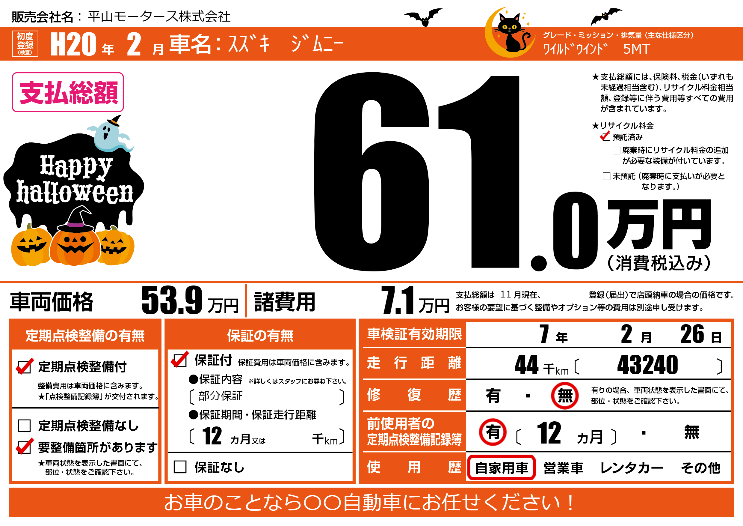 | 走行キロ | 4.4万km | 初年度登録 | H20年2月 |