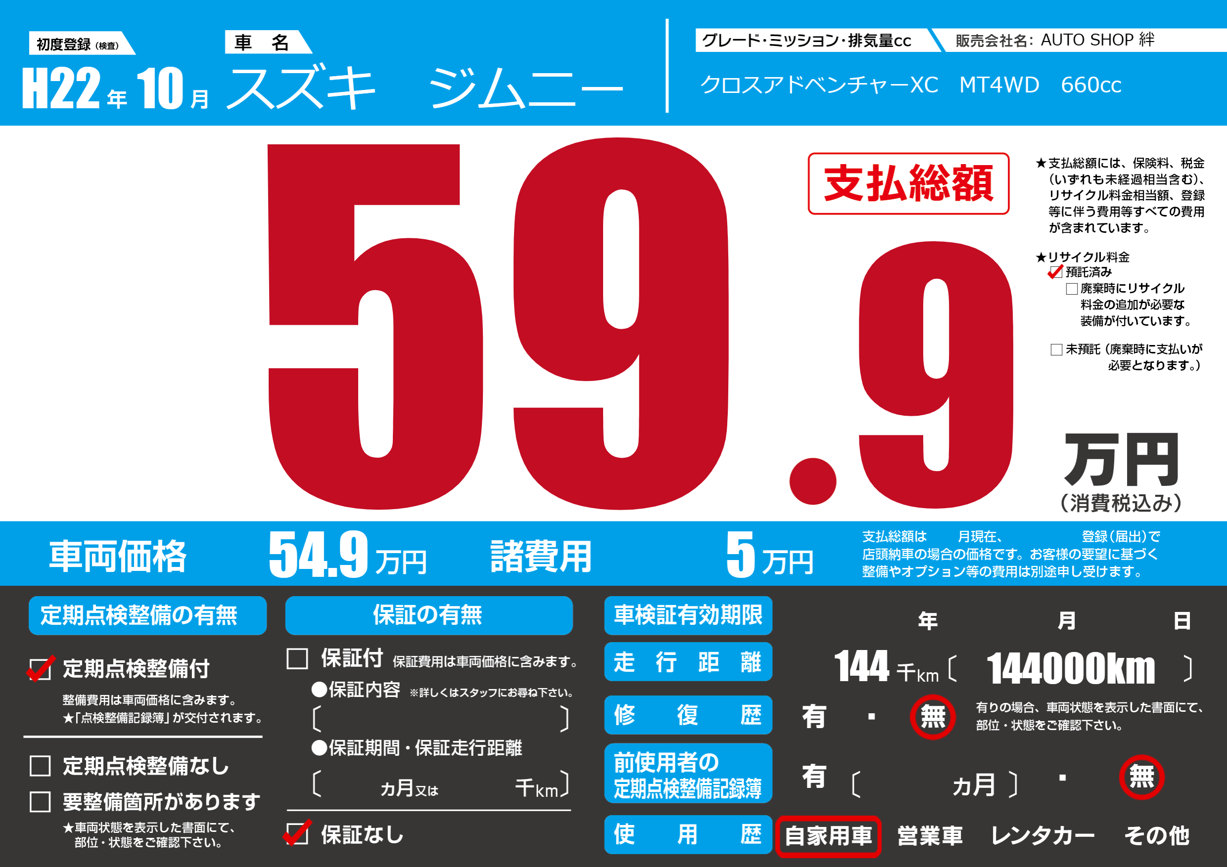 | 車名 | スズキ ジムニー | グレード ミッション 排気量 |