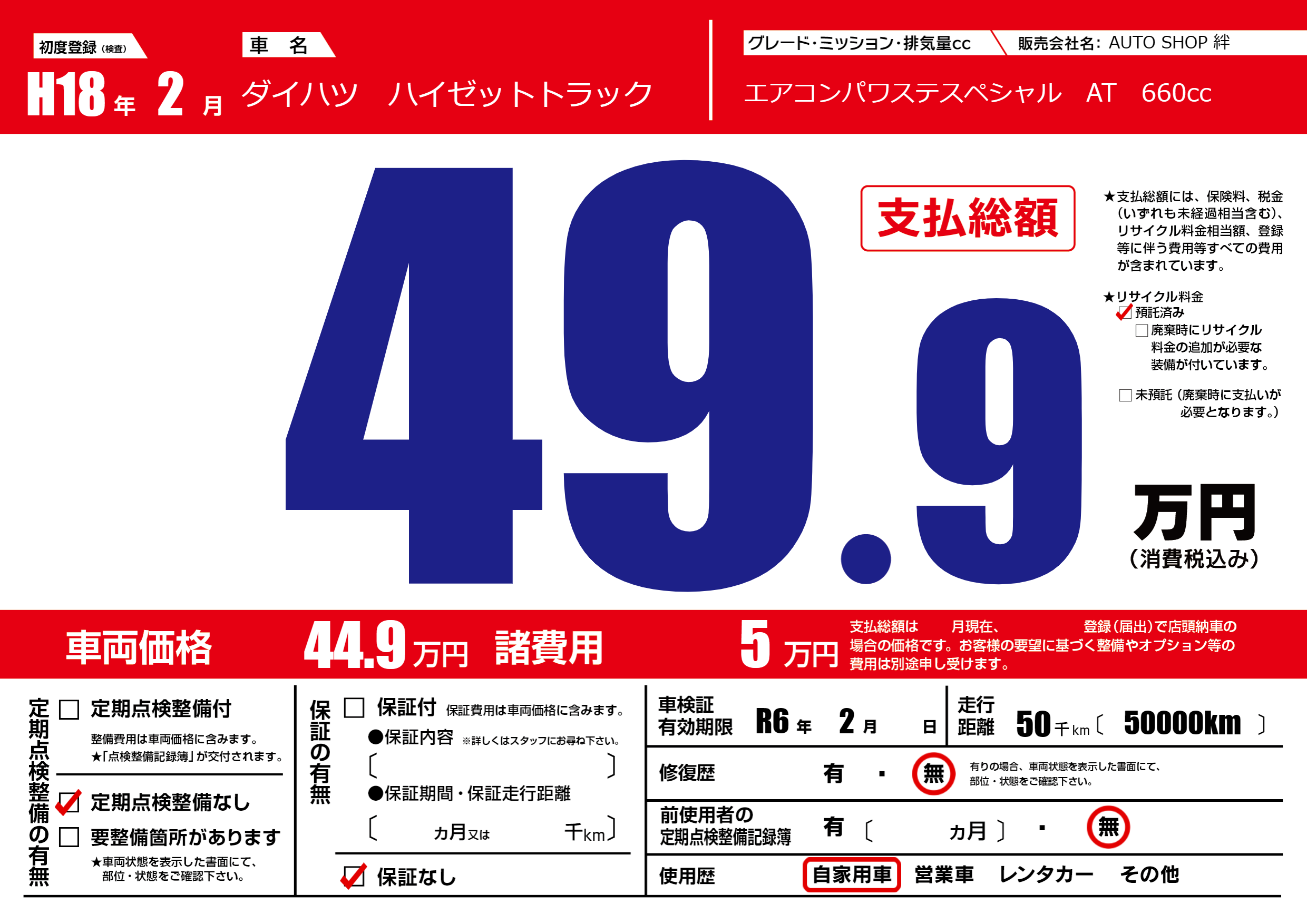 | 走行キロ | 5万km | 初年度登録 | H18年2月 |