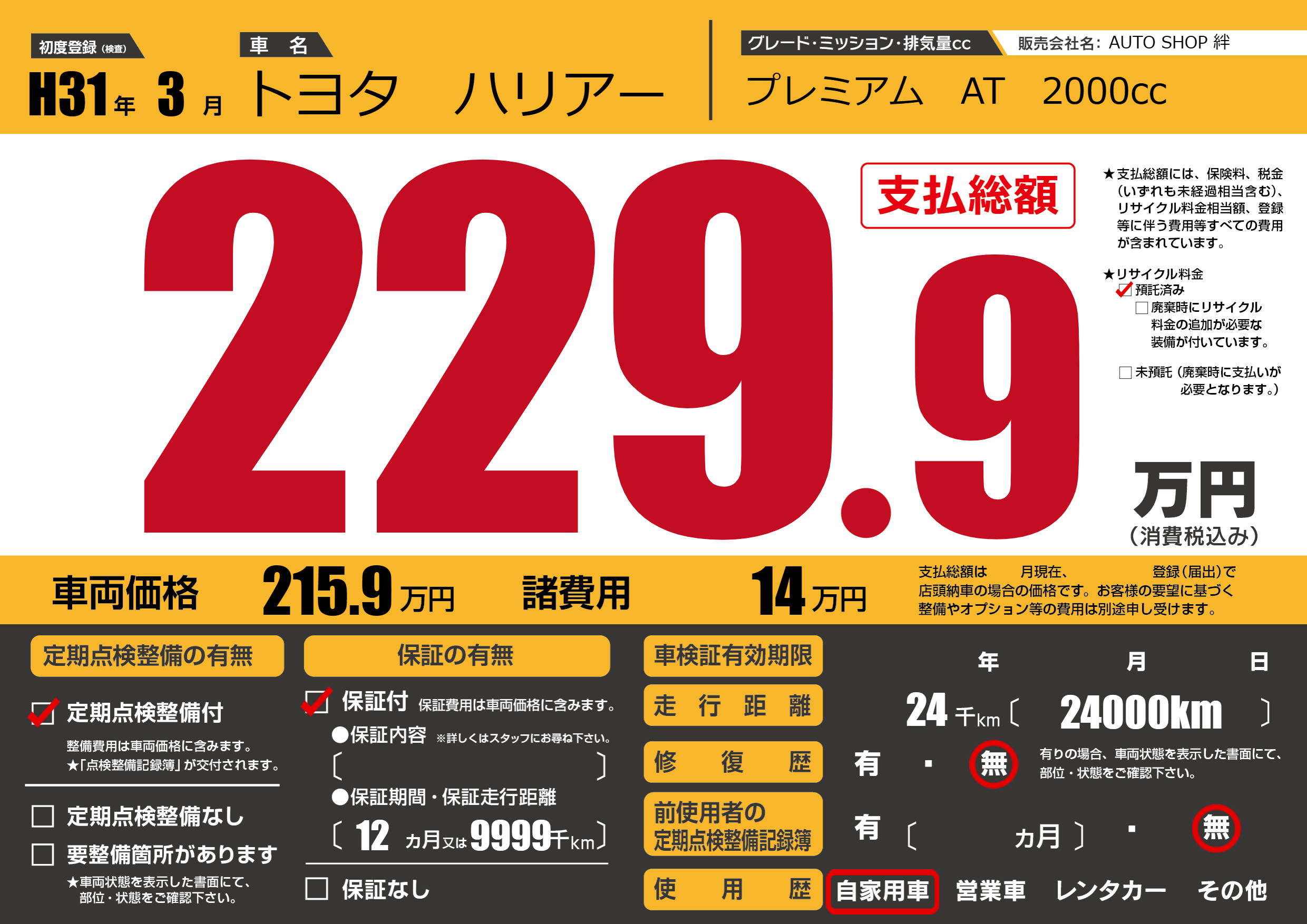 | 走行キロ | 2.4万km | 初年度登録 | H31年3月 |