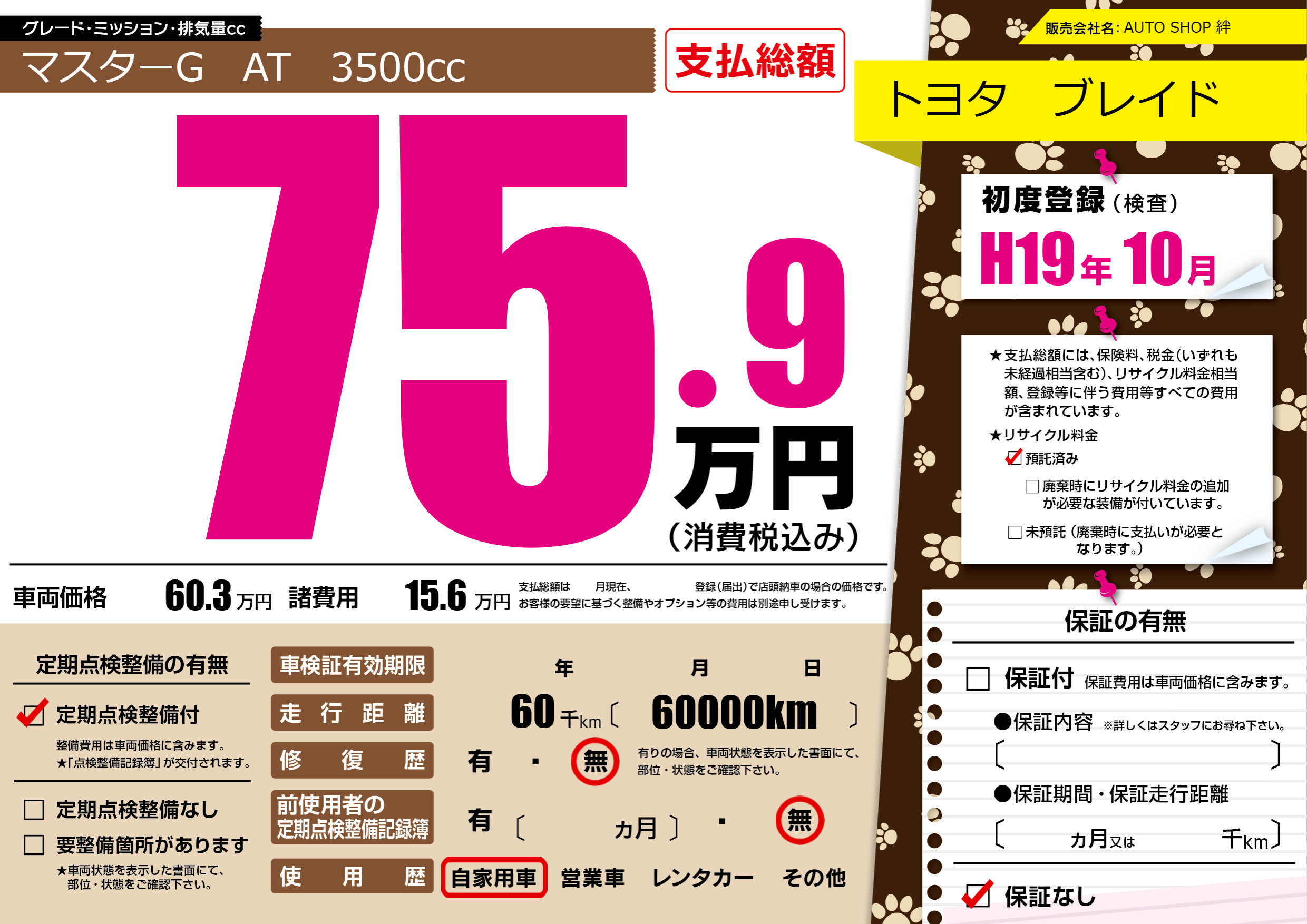 | 車検制限 | - 年 - 月 - 日 | ||