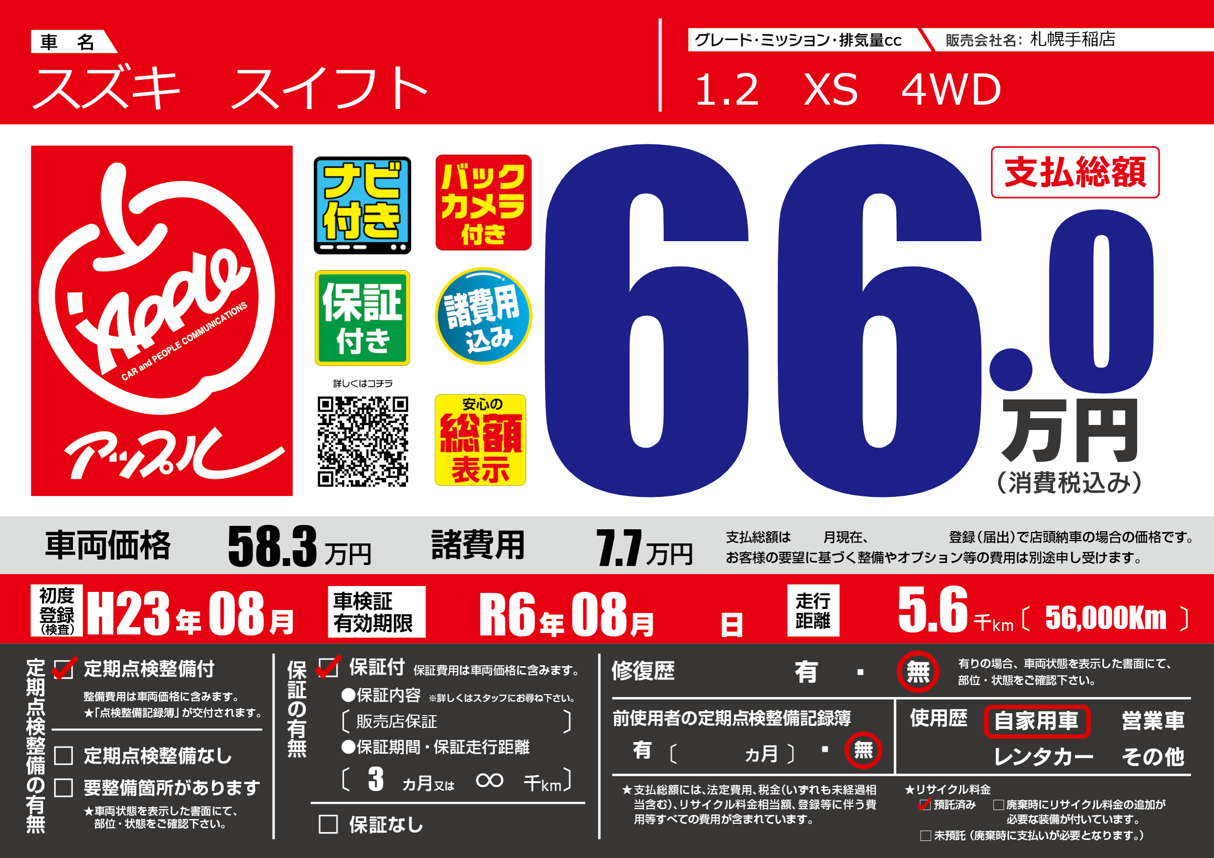 | 走行キロ | 0.5万km | 初年度登録 | H23年08月 |