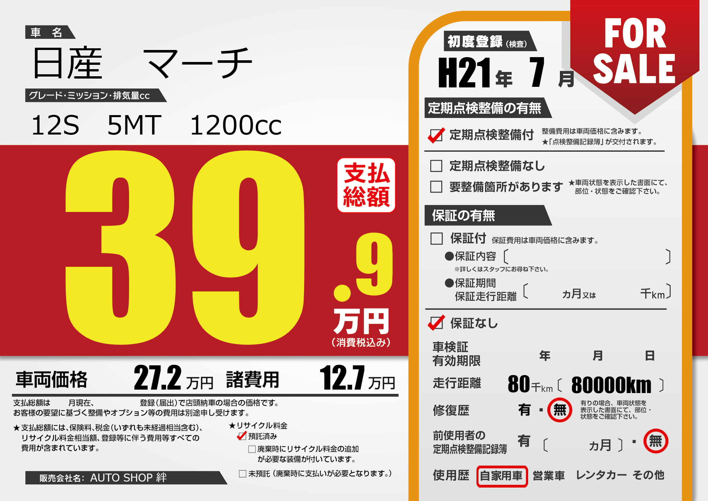 | 車名 | 日産 マーチ | グレード ミッション 排気量 |