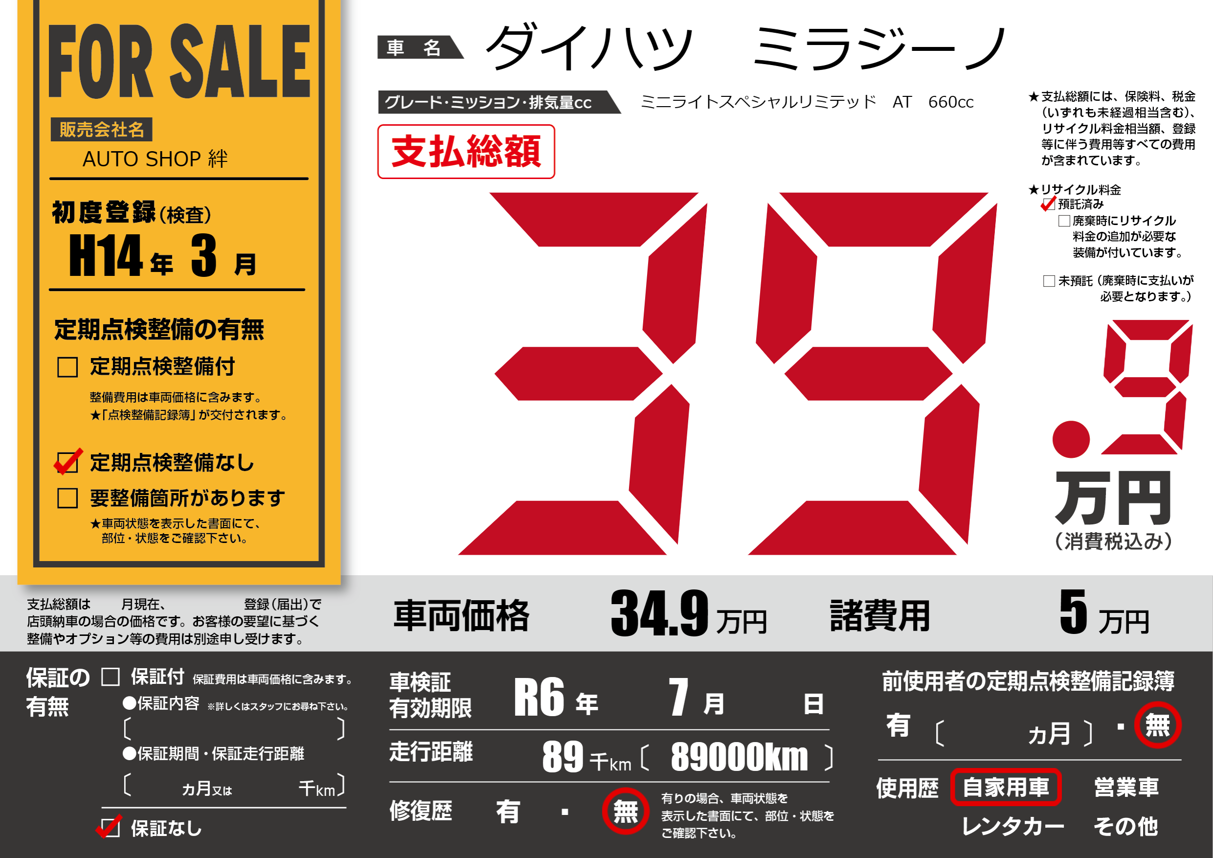 | 走行キロ | 8.9万km | 初年度登録 | H14年3月 |