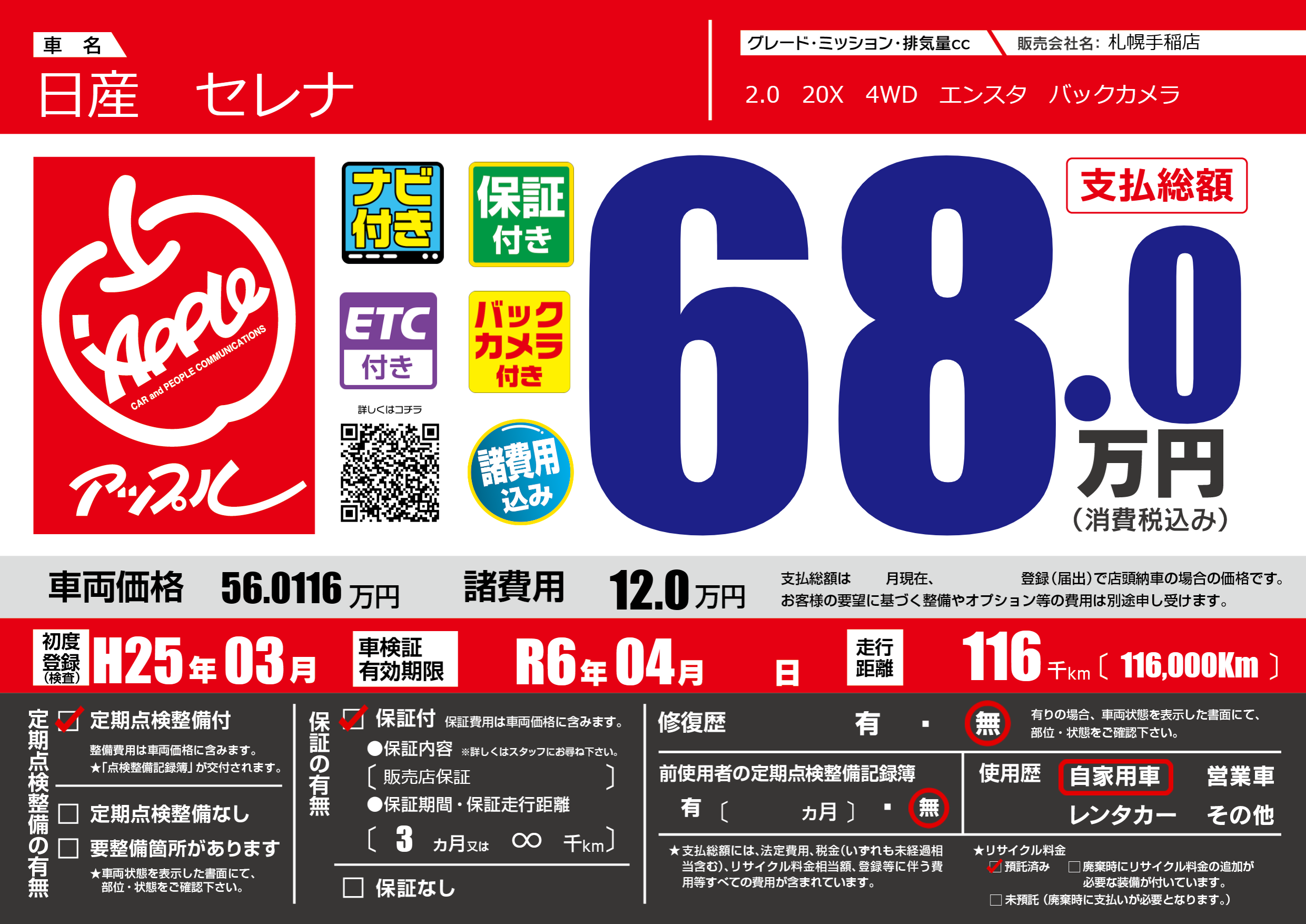 | 走行キロ | 11.6万km | 初年度登録 | H25年03月 |
