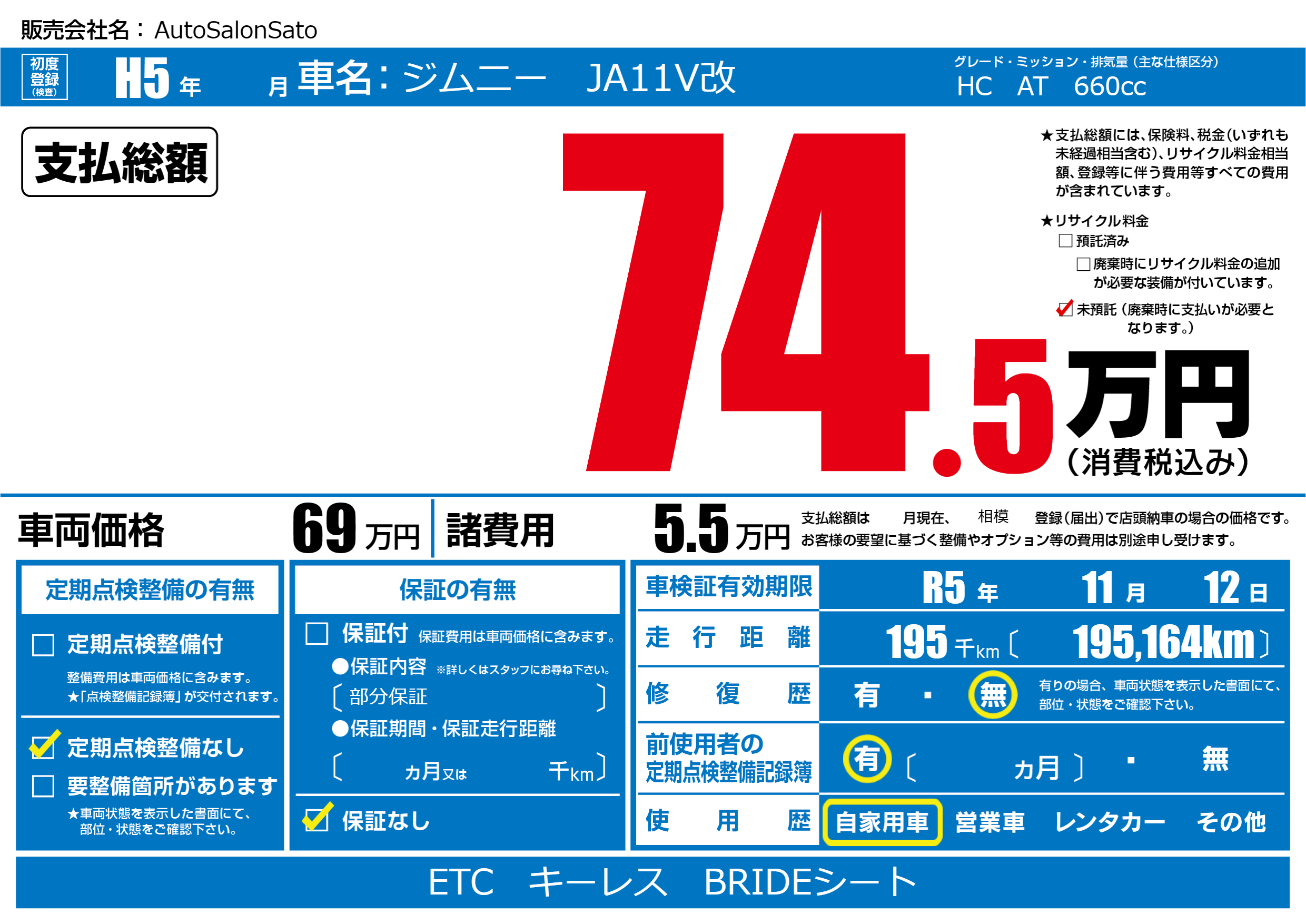 | 走行キロ | 19.5万km | 初年度登録 | H5年---月 |