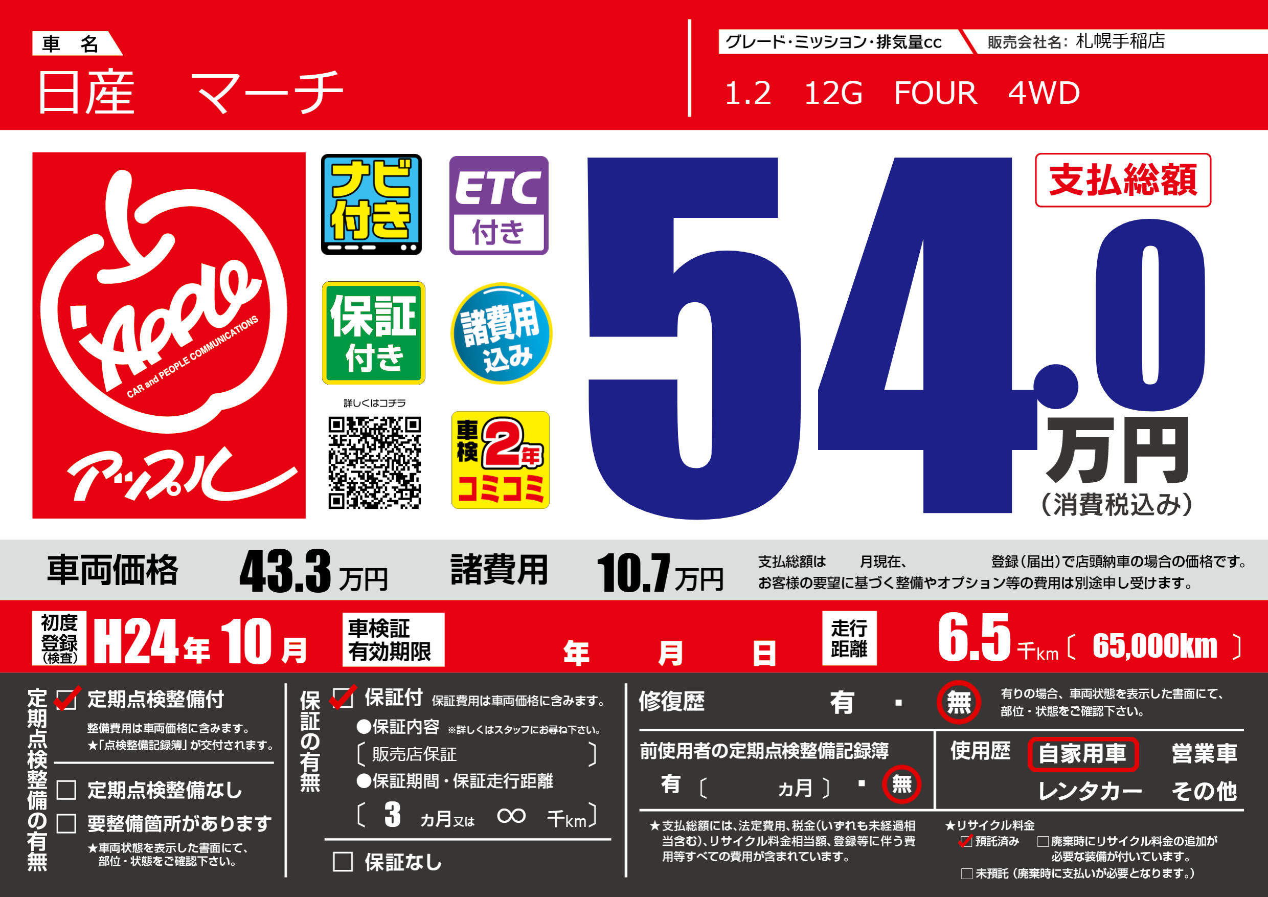 | 走行キロ | 0.6万km | 初年度登録 | H24年10月 |
