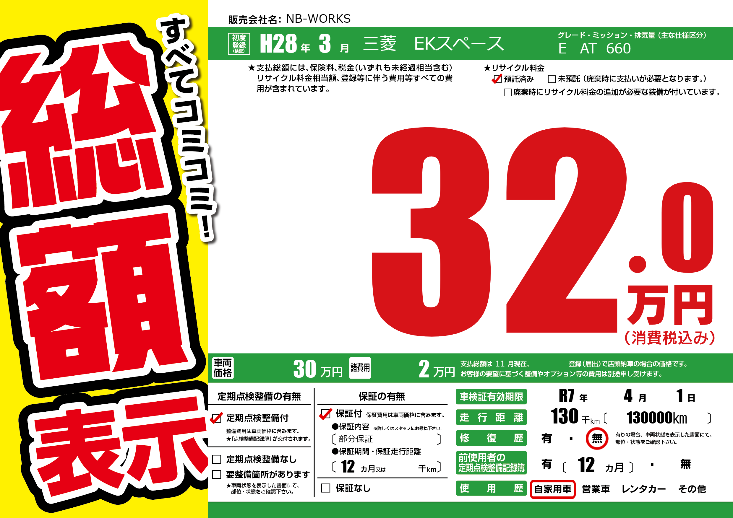 | 走行キロ | 13万km | 初年度登録 | H28年3月 |
