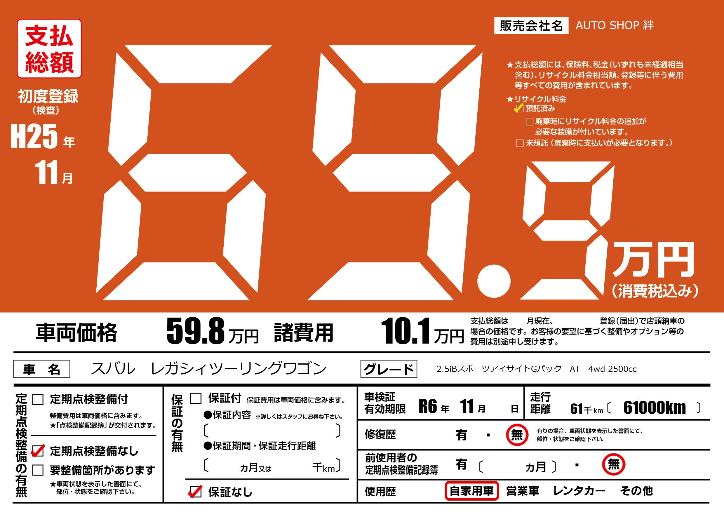 | 車検制限 | R6年 11月 - 日 | ||