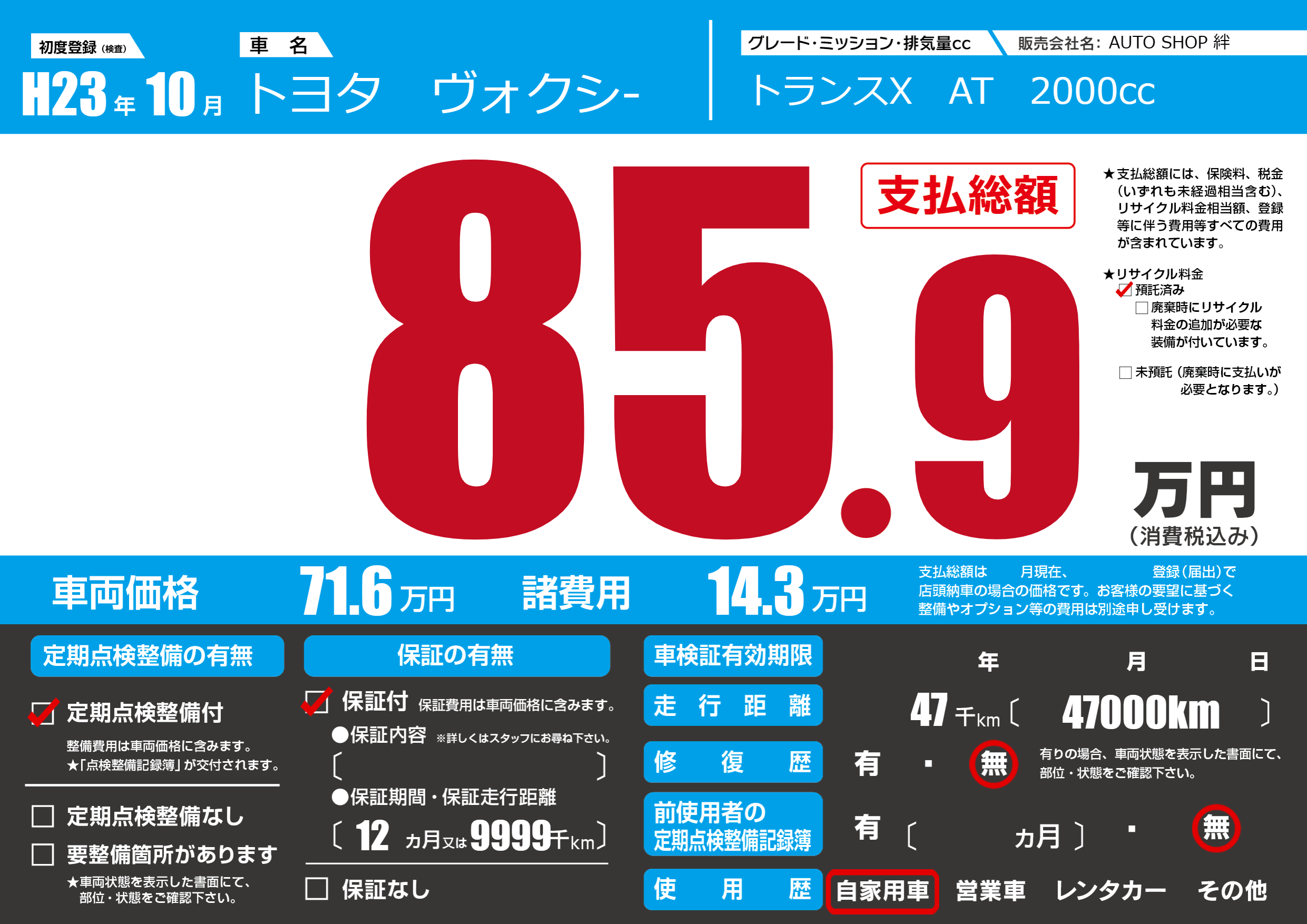 | 走行キロ | 4.7万km | 初年度登録 | H23年10月 |