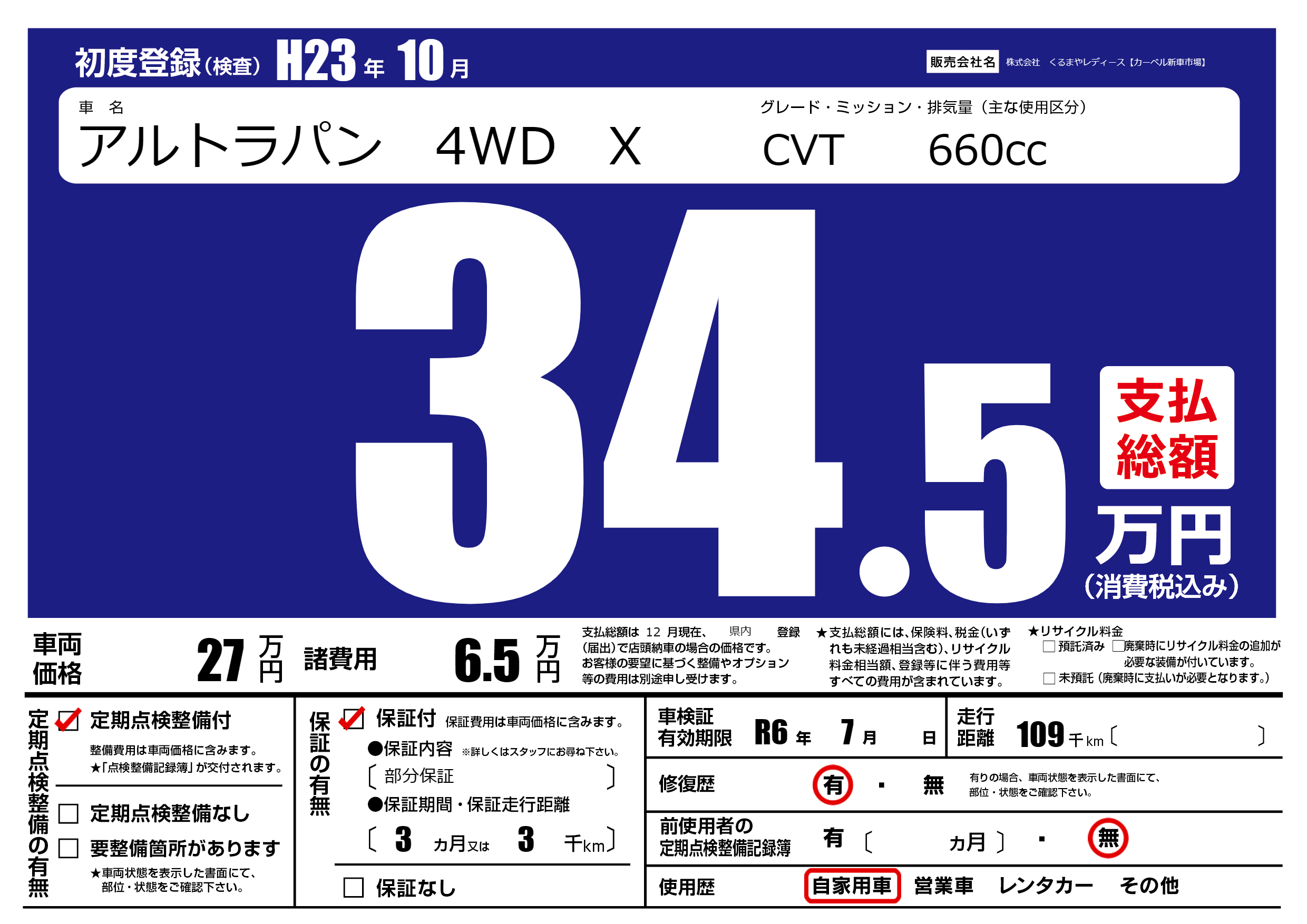 | 走行キロ | 10.9万km | 初年度登録 | H23年10月 |