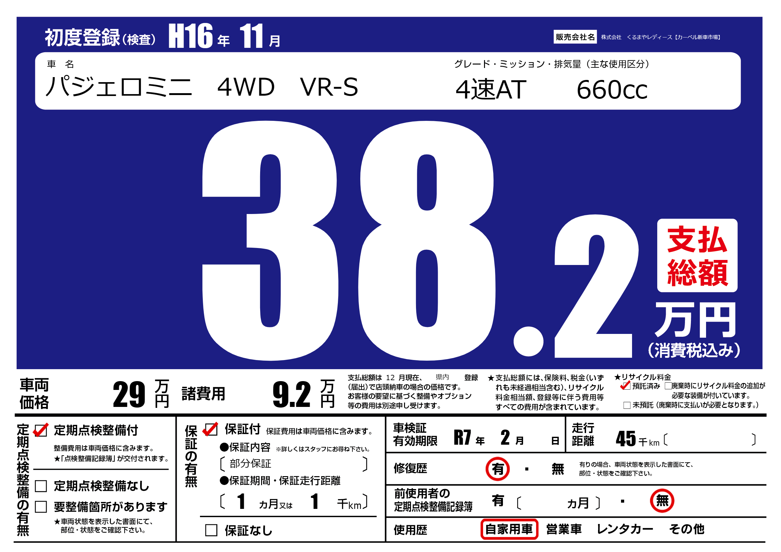 | 車名 | パジェロミニ 4WD VR-S | グレード ミッション 排気量 |