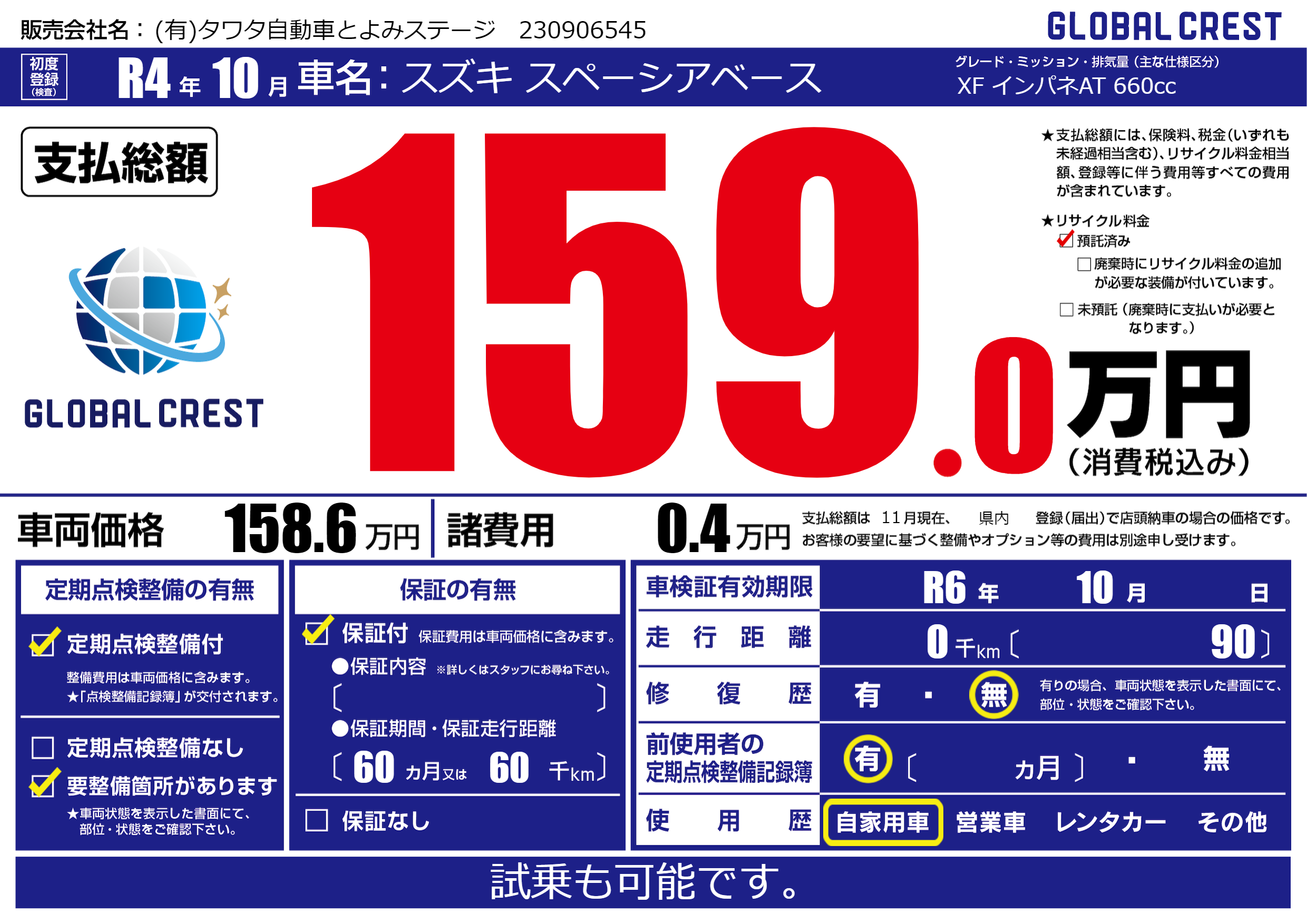 | 車名 | スズキ スペーシアベース | グレード ミッション 排気量 |