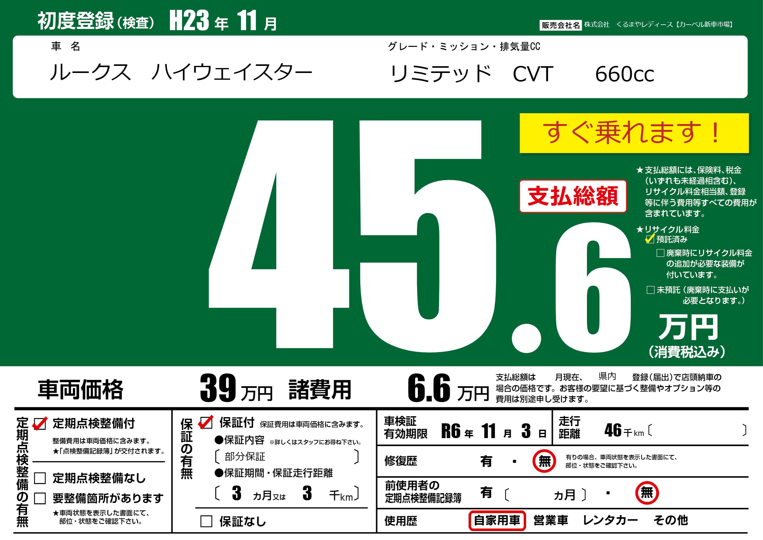 | 走行キロ | 4.6万km | 初年度登録 | H23年11月 |