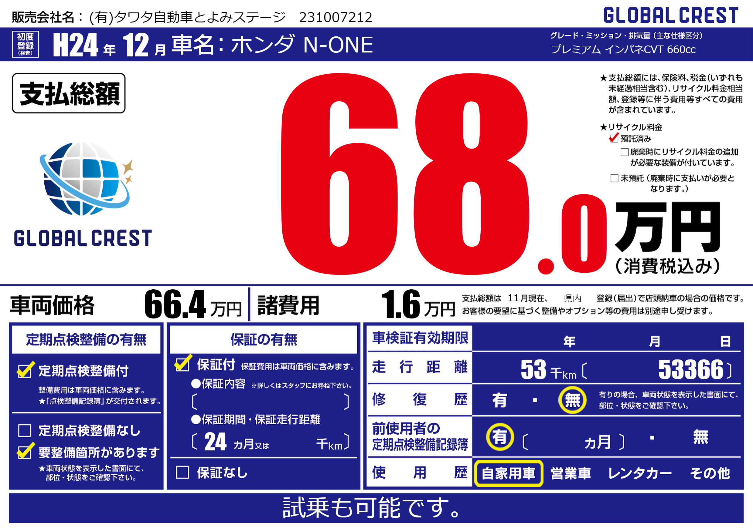 | 車名 | ホンダ N-ONE | グレード ミッション 排気量 |