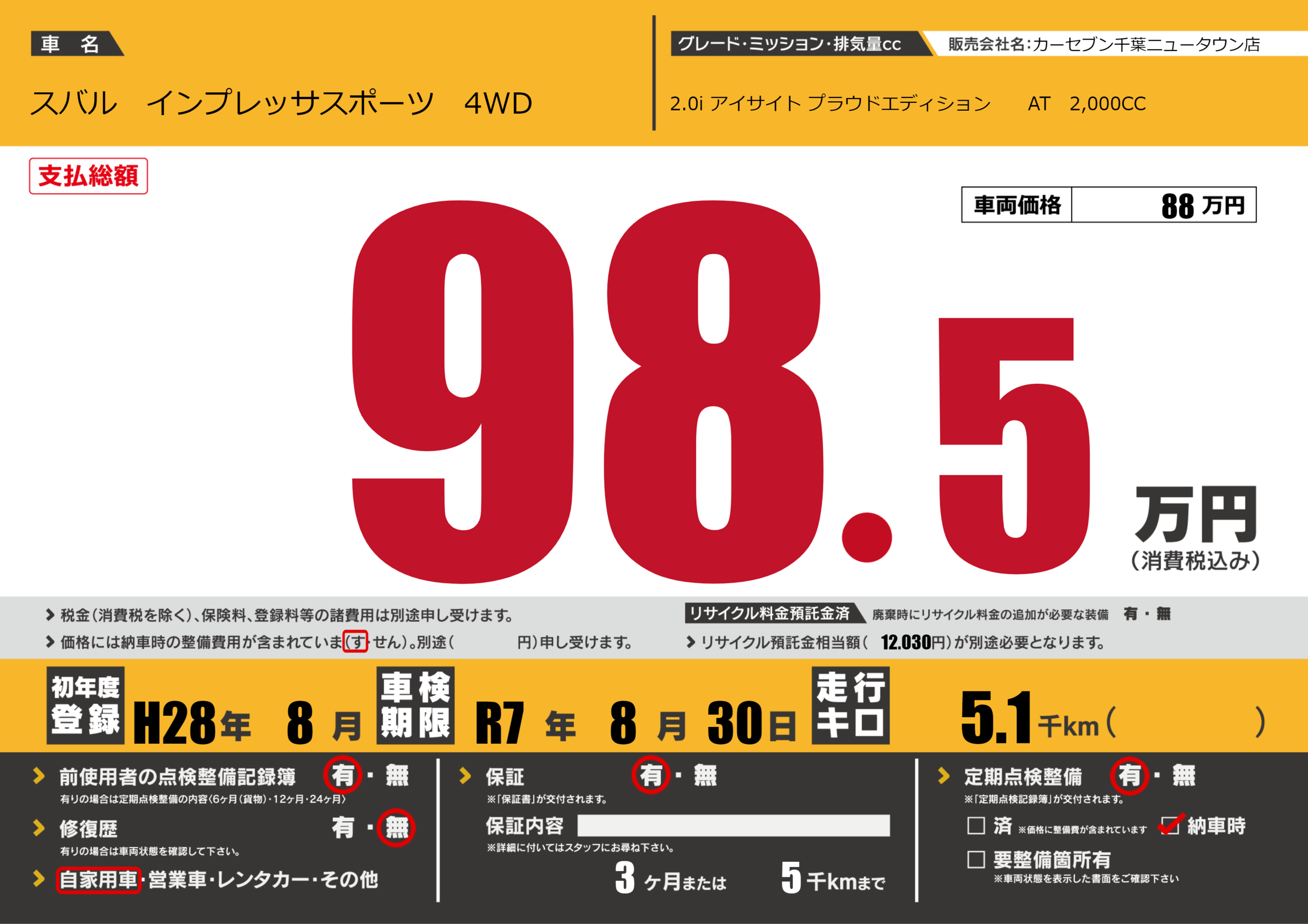 | 車名 | スバル インプレッサスポーツ 4WD | グレード ミッション 排気量 |