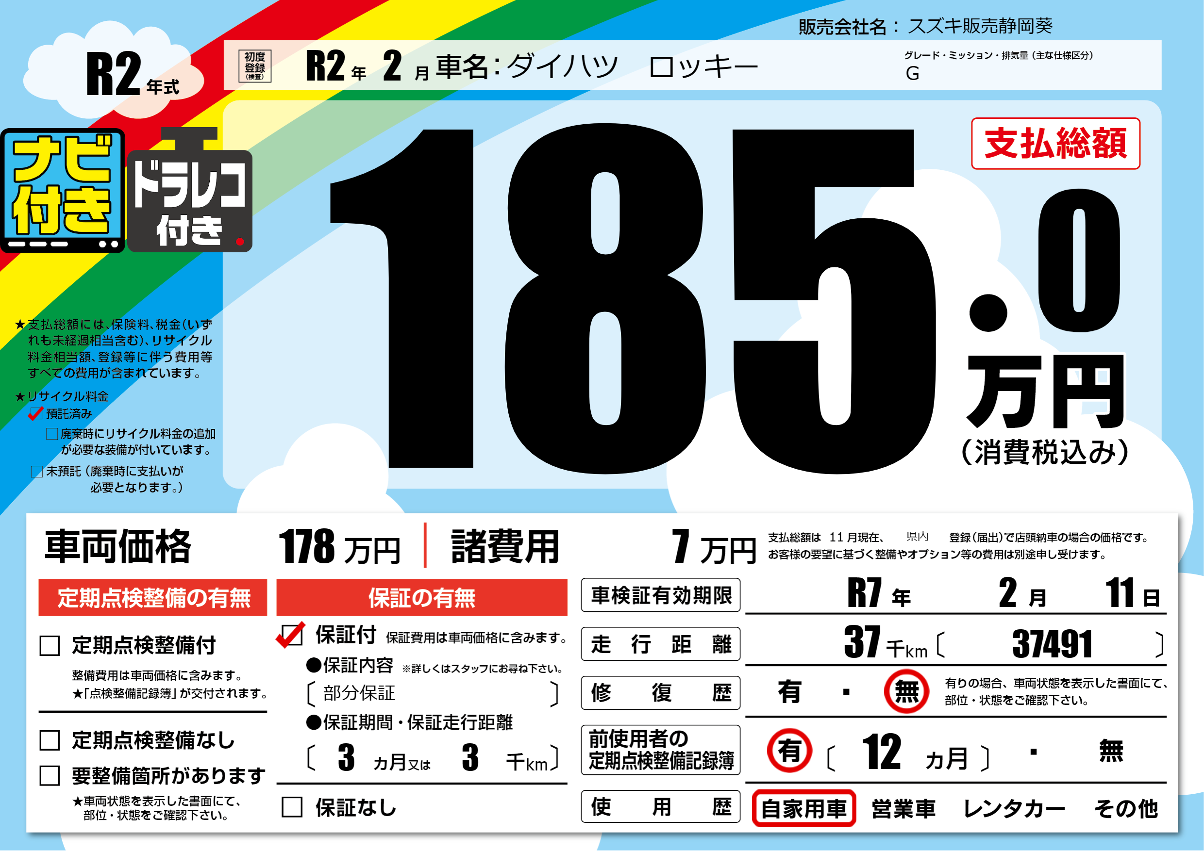 | 走行キロ | 3.7万km | 初年度登録 | R2年2月 |
