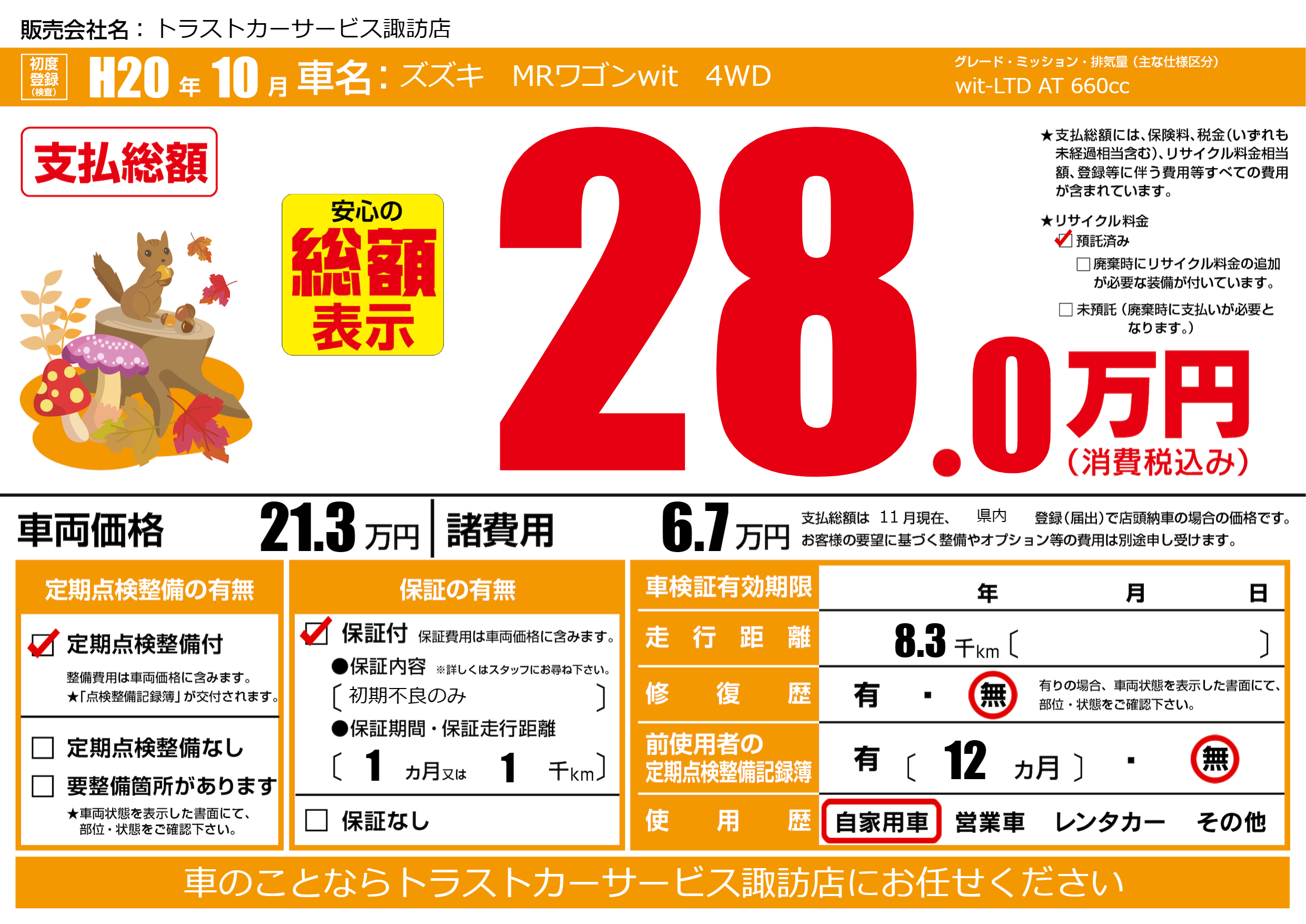 | 車名 | ズズキ MRワゴンwit 4WD | グレード ミッション 排気量 |