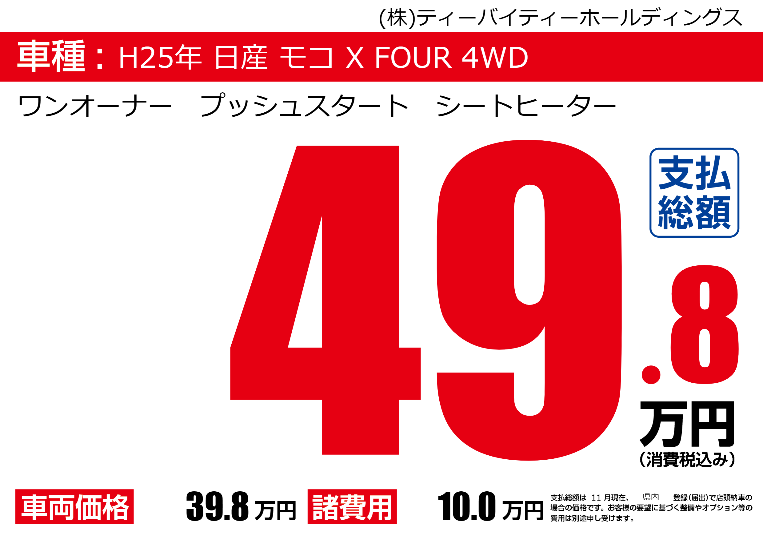 | 車名 | H25年 日産 モコ X FOUR 4WD | グレード ミッション 排気量 |