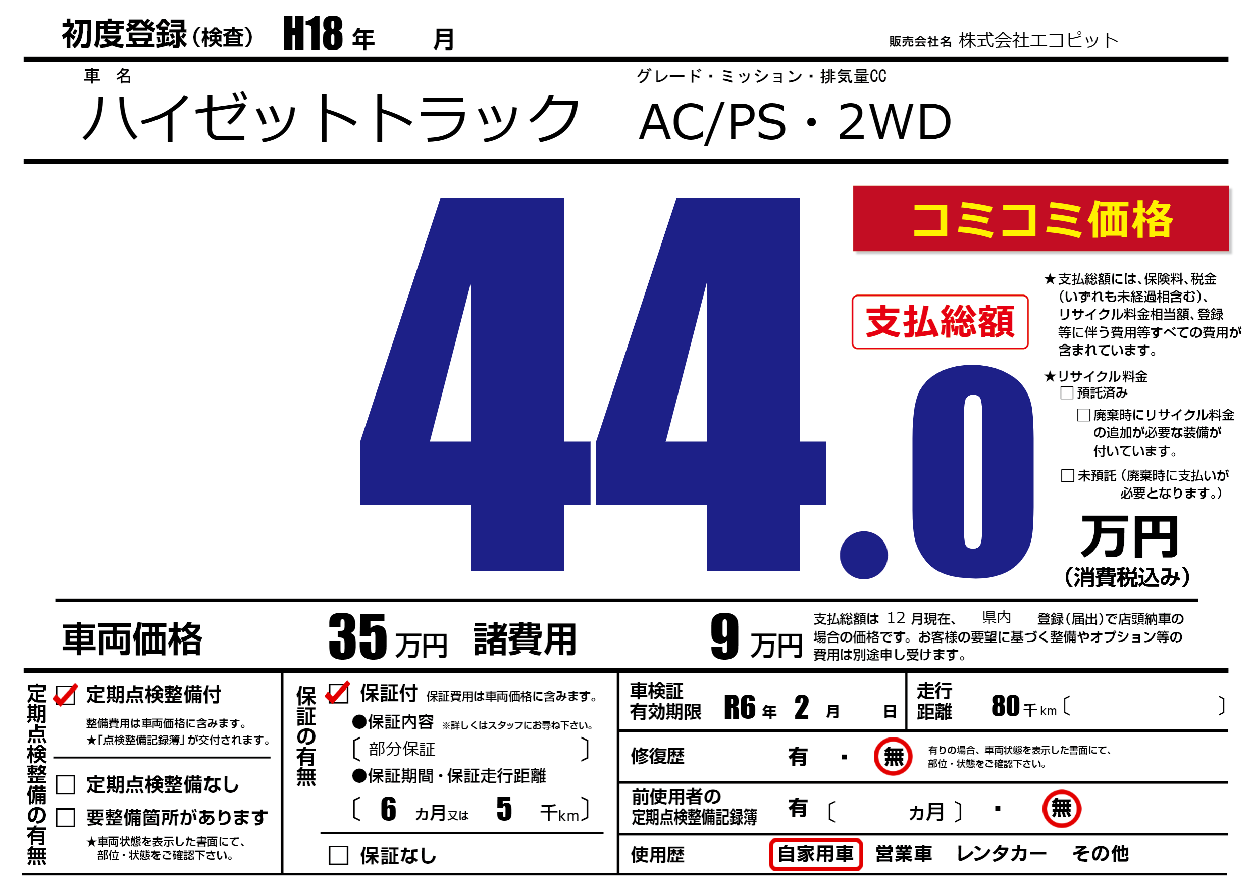 保証付き 保証内容(部分保証) 6ヶ月または(5)千kmまで |