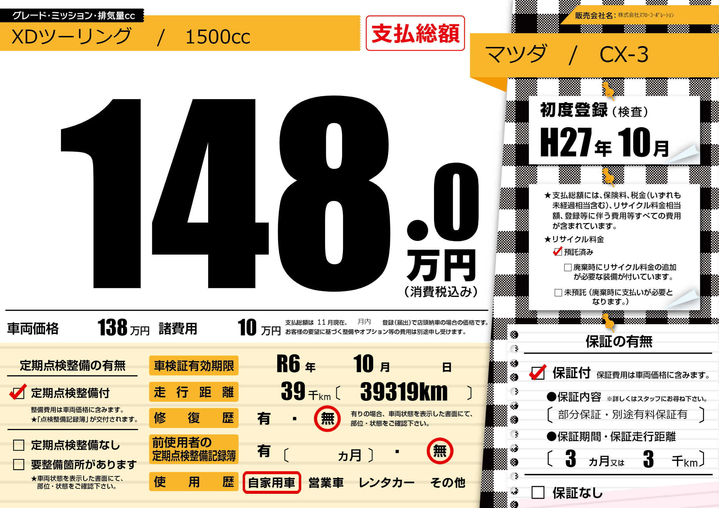 | 車名 | マツダ / CX-3 | グレード ミッション 排気量 |
