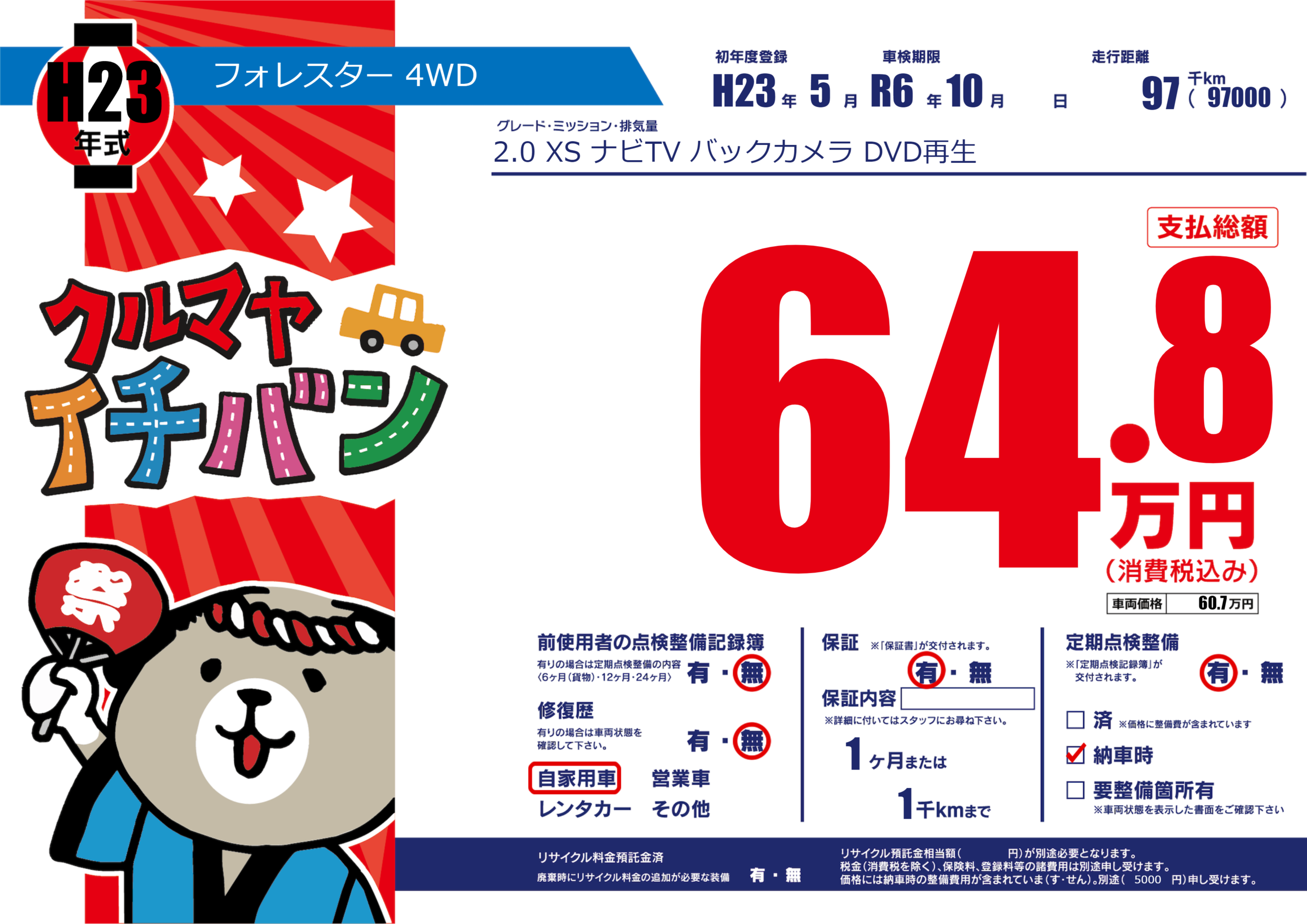 | 定期点検整備 | 定期点検整備あり 納車時あり | ||