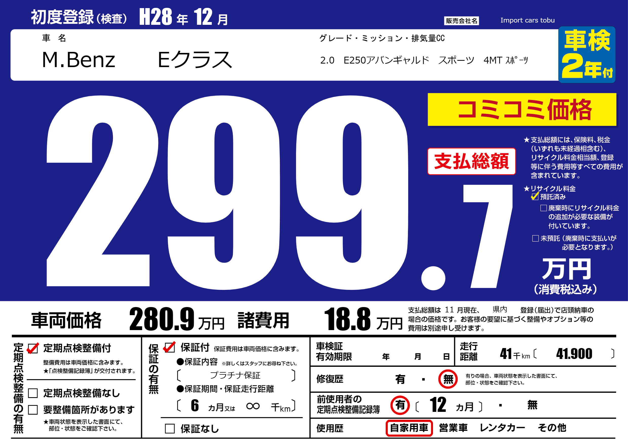 | 車名 | M.Benz Eクラス | グレード ミッション 排気量 |