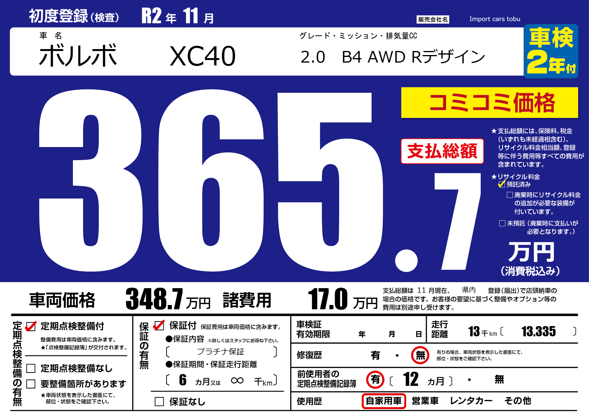 | 車名 | ボルボ XC40 | グレード ミッション 排気量 |