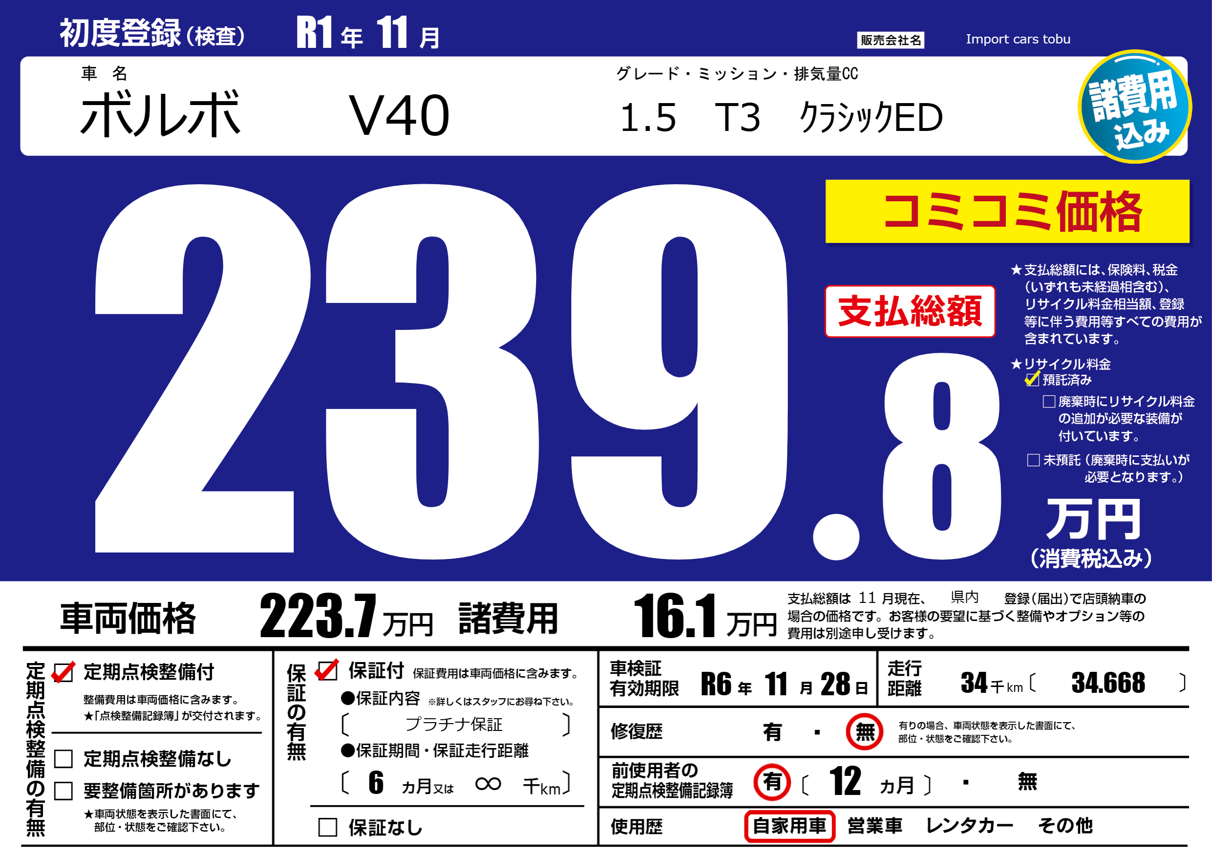 | 車名 | ボルボ V40 | グレード ミッション 排気量 |