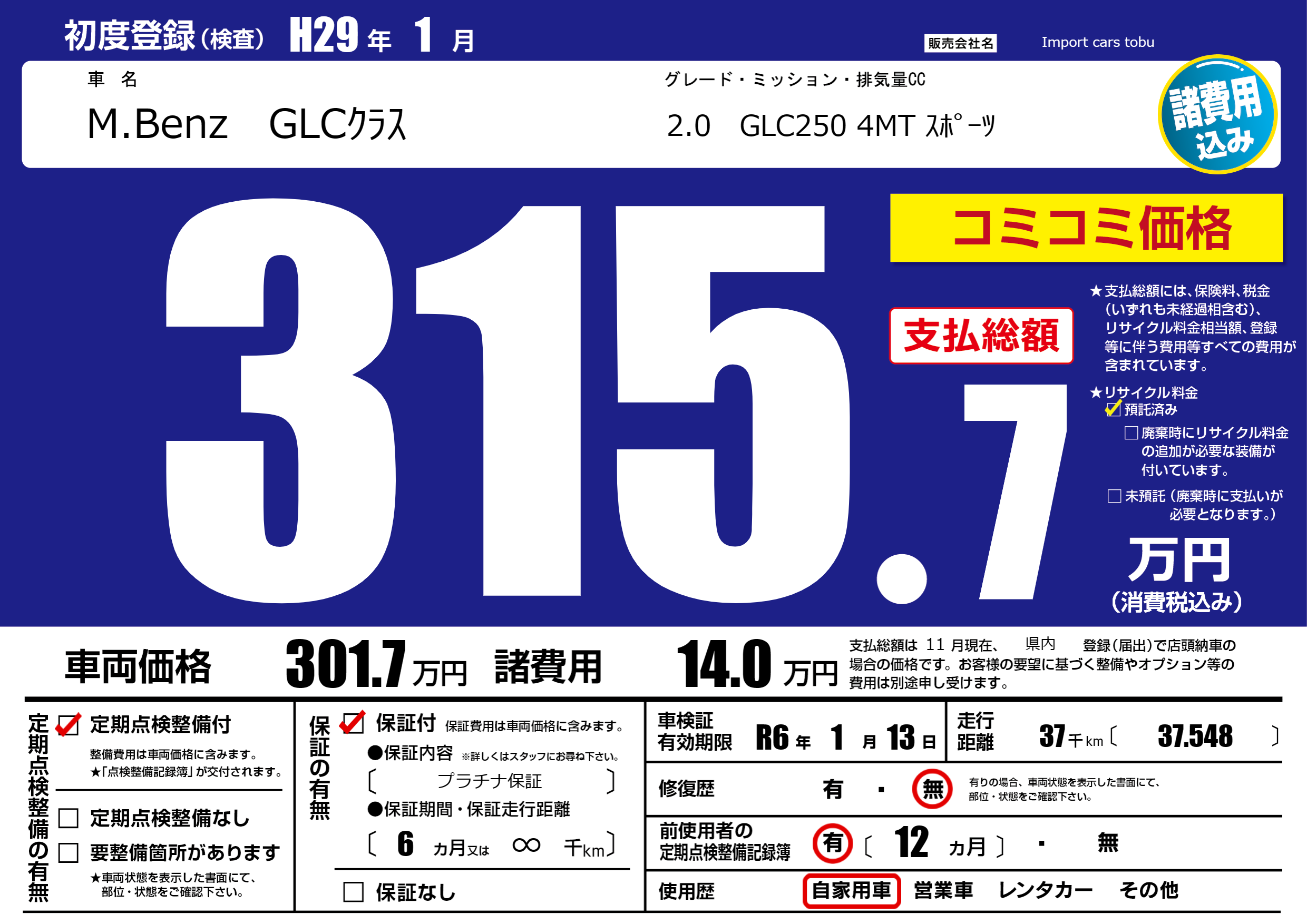 | 車名 | M.Benz GLCクラス | グレード ミッション 排気量 |