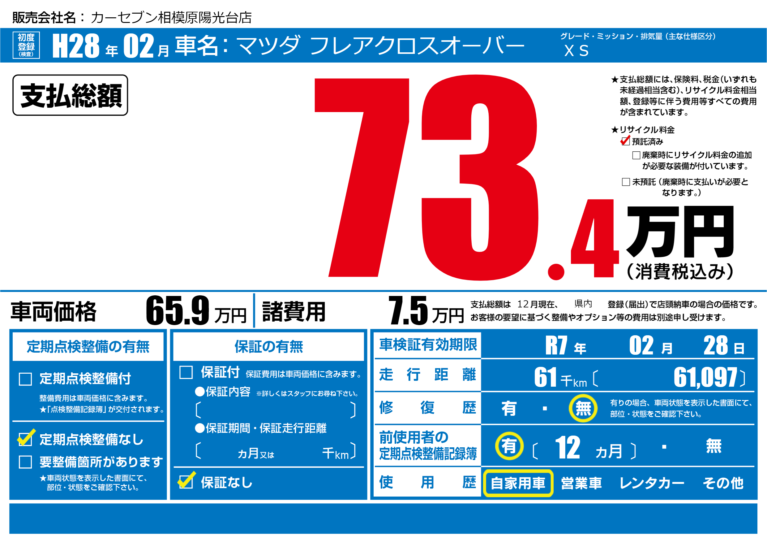 | 走行キロ | 6.1万km | 初年度登録 | H28年02月 |