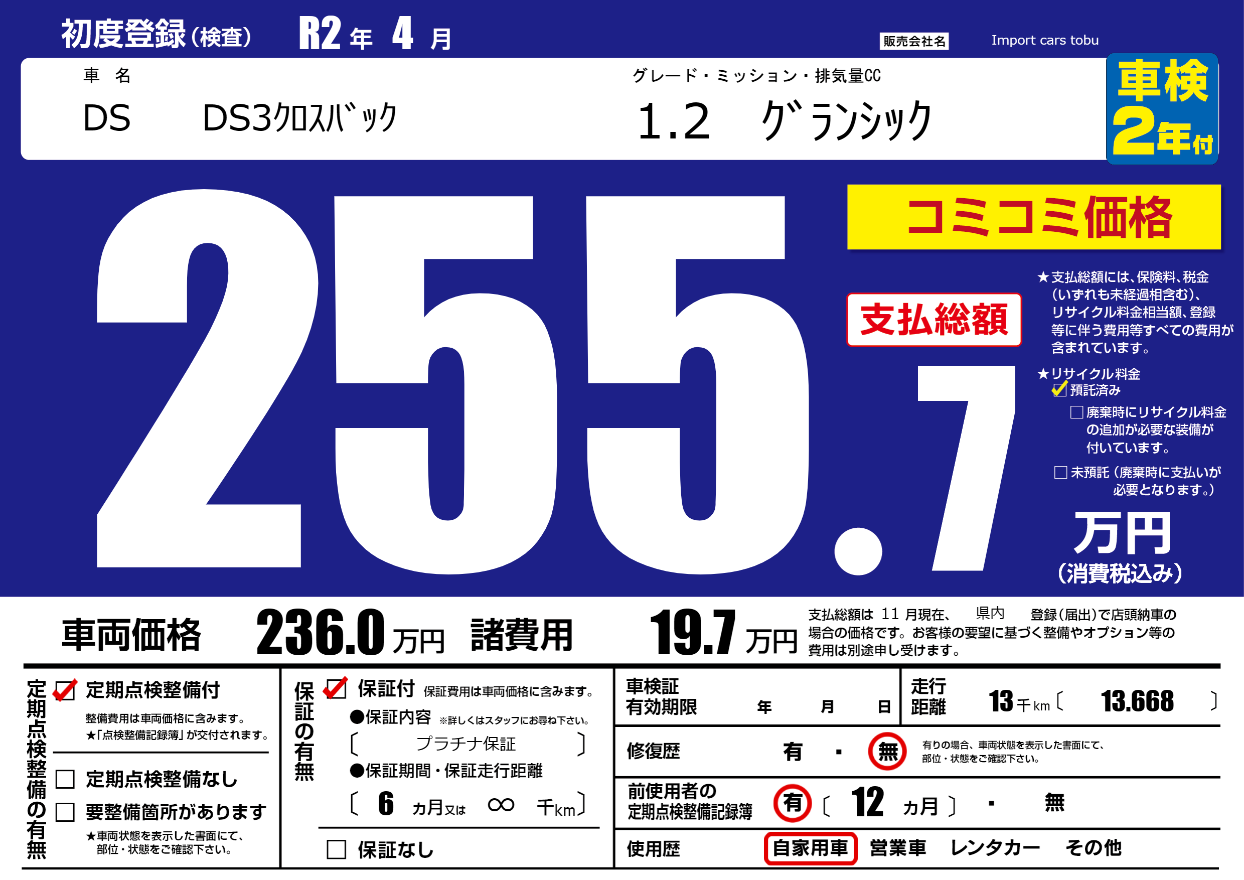 | 車名 | DS DS3クロスバック | グレード ミッション 排気量 |