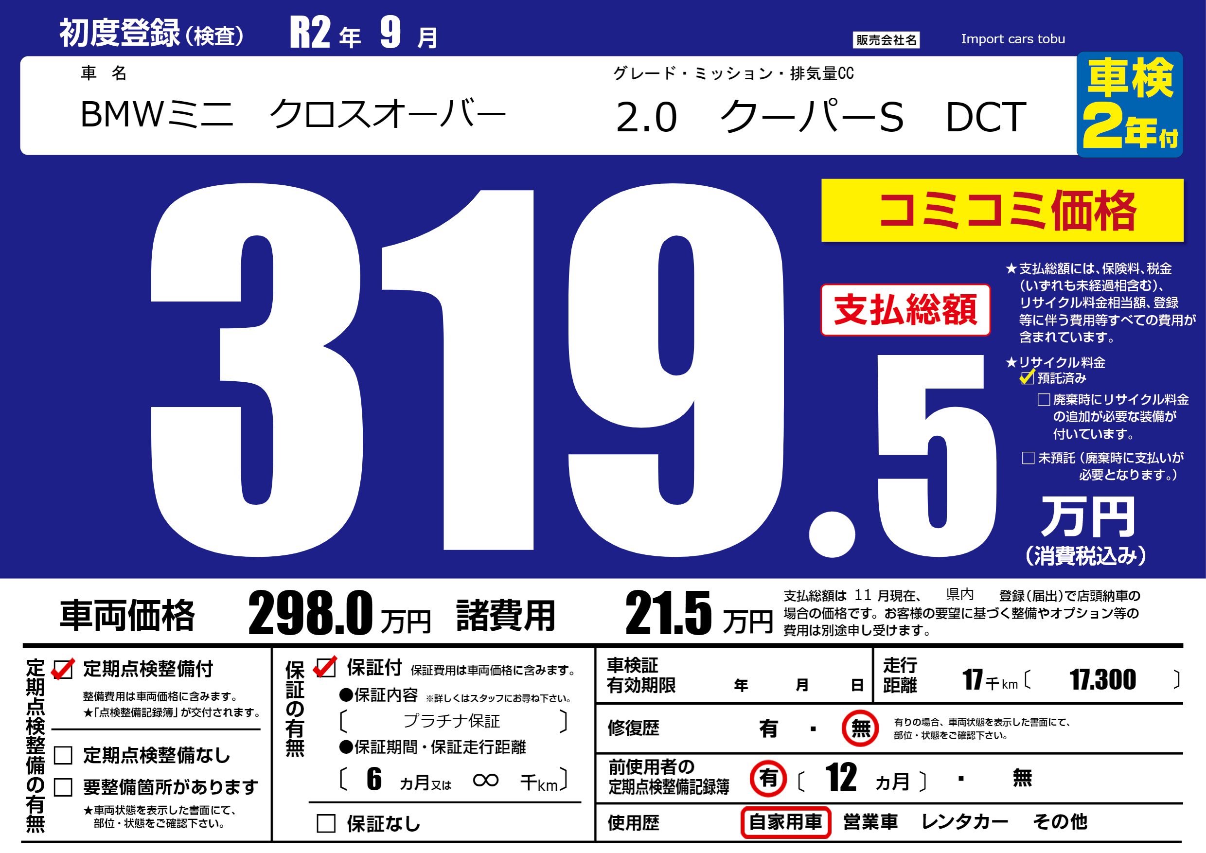 | 車名 | BMWミニ クロスオーバー | グレード ミッション 排気量 |