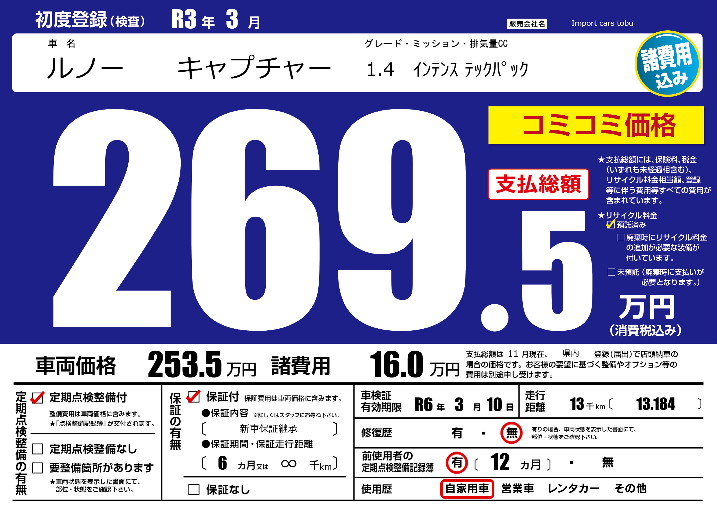 | 車検制限 | R6年 3月 10日 | ||