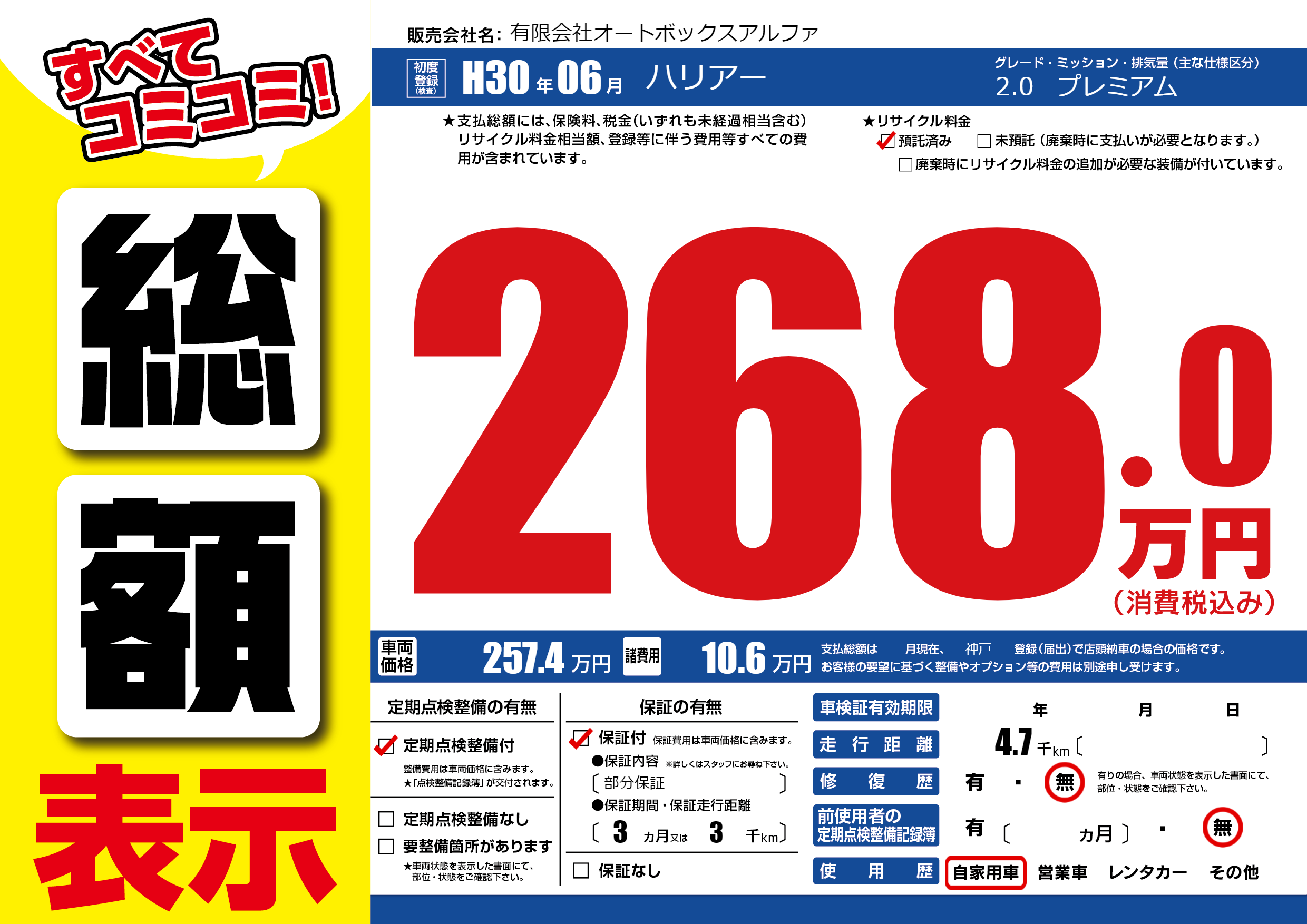| 走行キロ | 0.4万km | 初年度登録 | H30年06月 |
