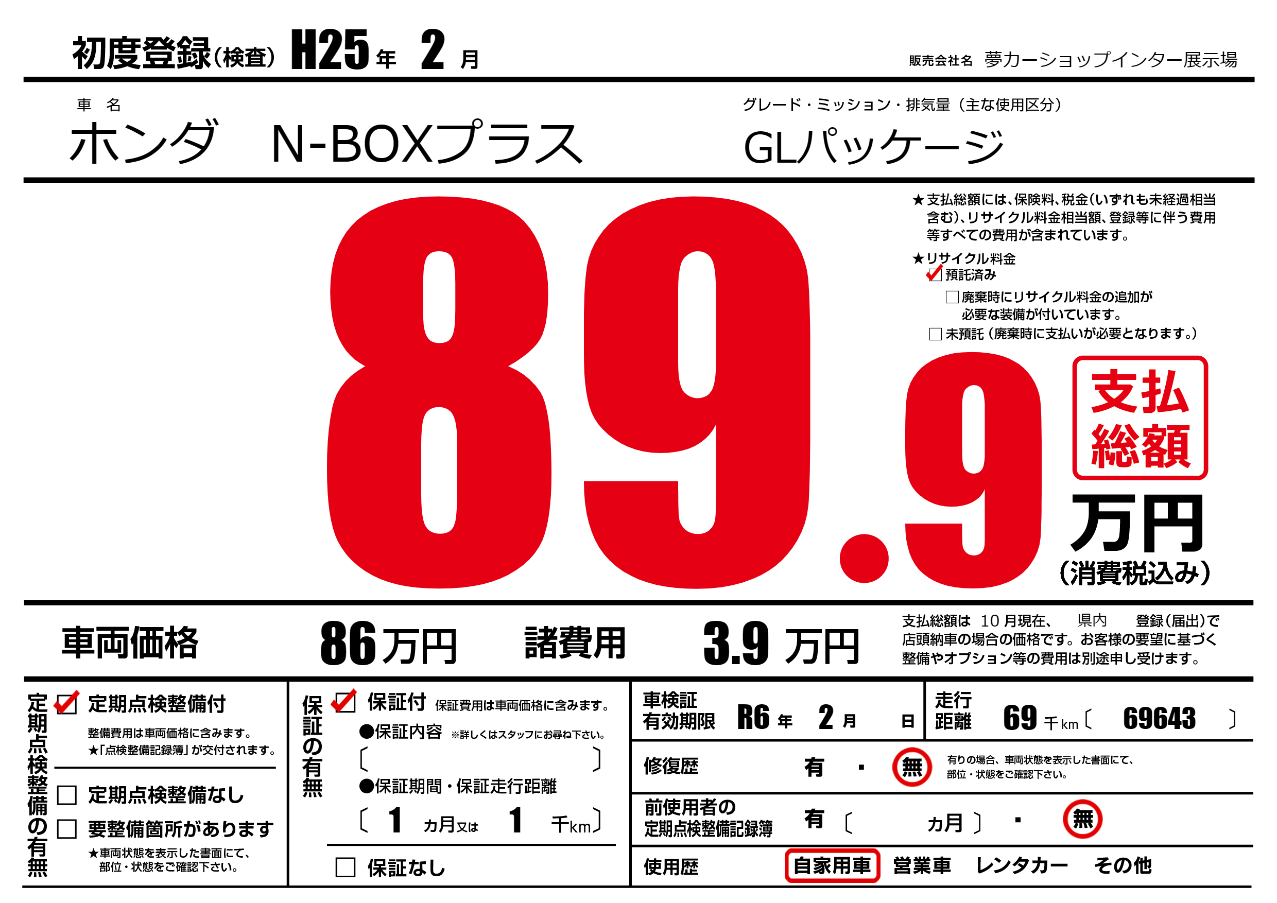 | 車名 | ホンダ N-BOXプラス | グレード ミッション 排気量 |
