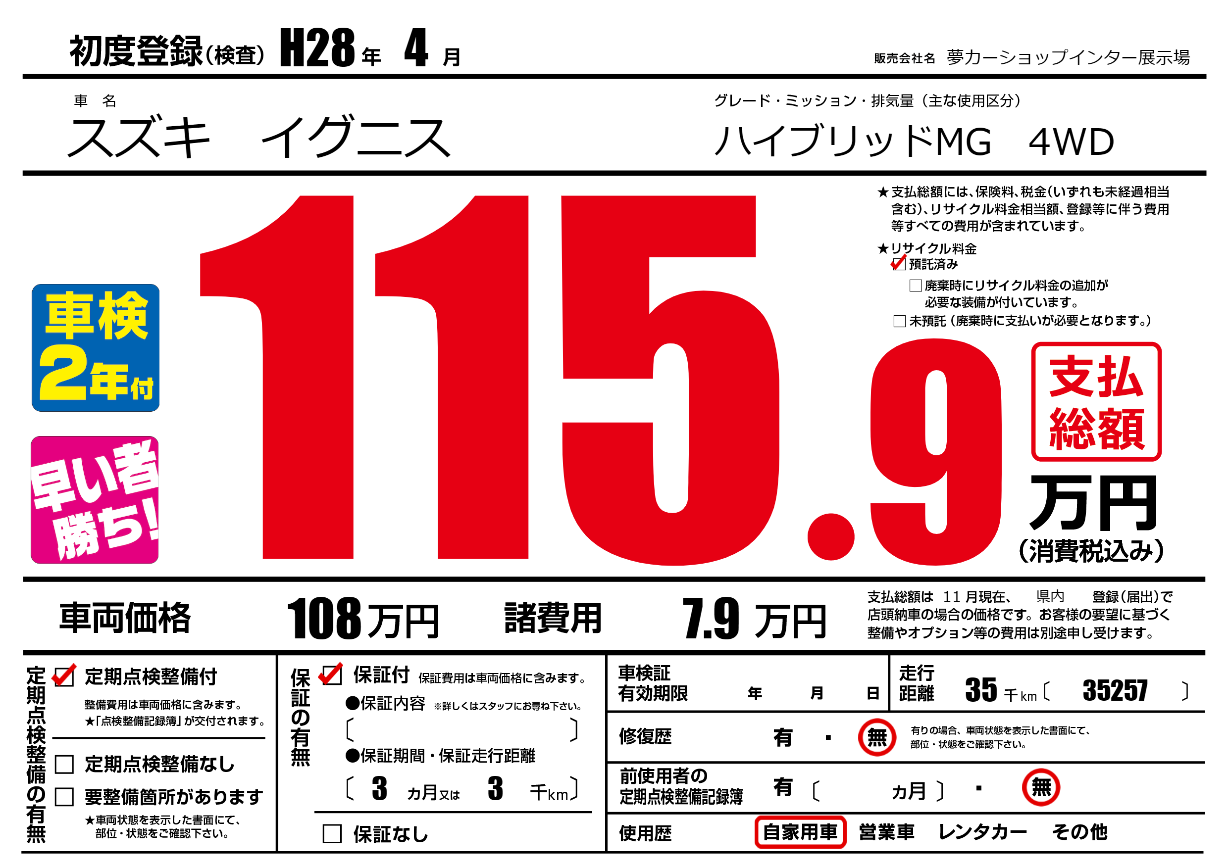 | 車名 | スズキ イグニス | グレード ミッション 排気量 |