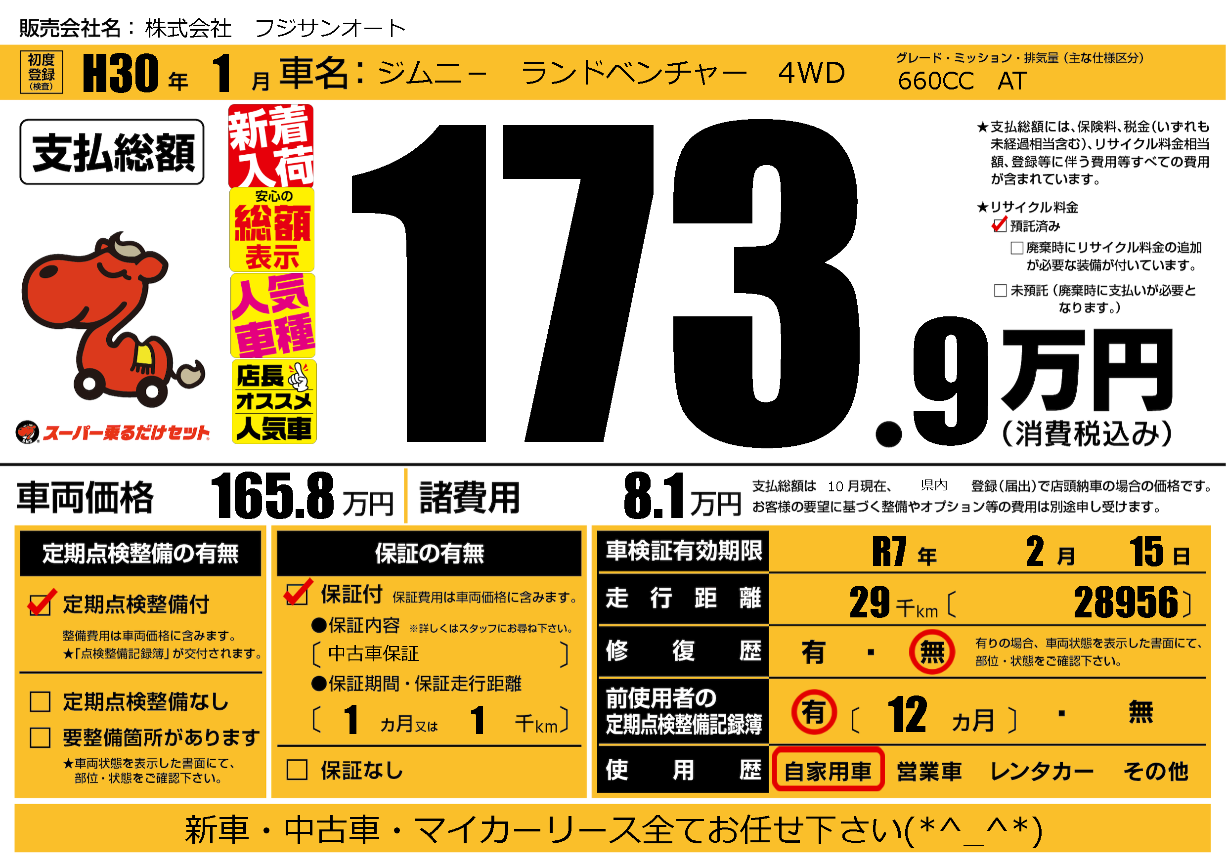 | 車検制限 | R7年 2月 15日 | ||